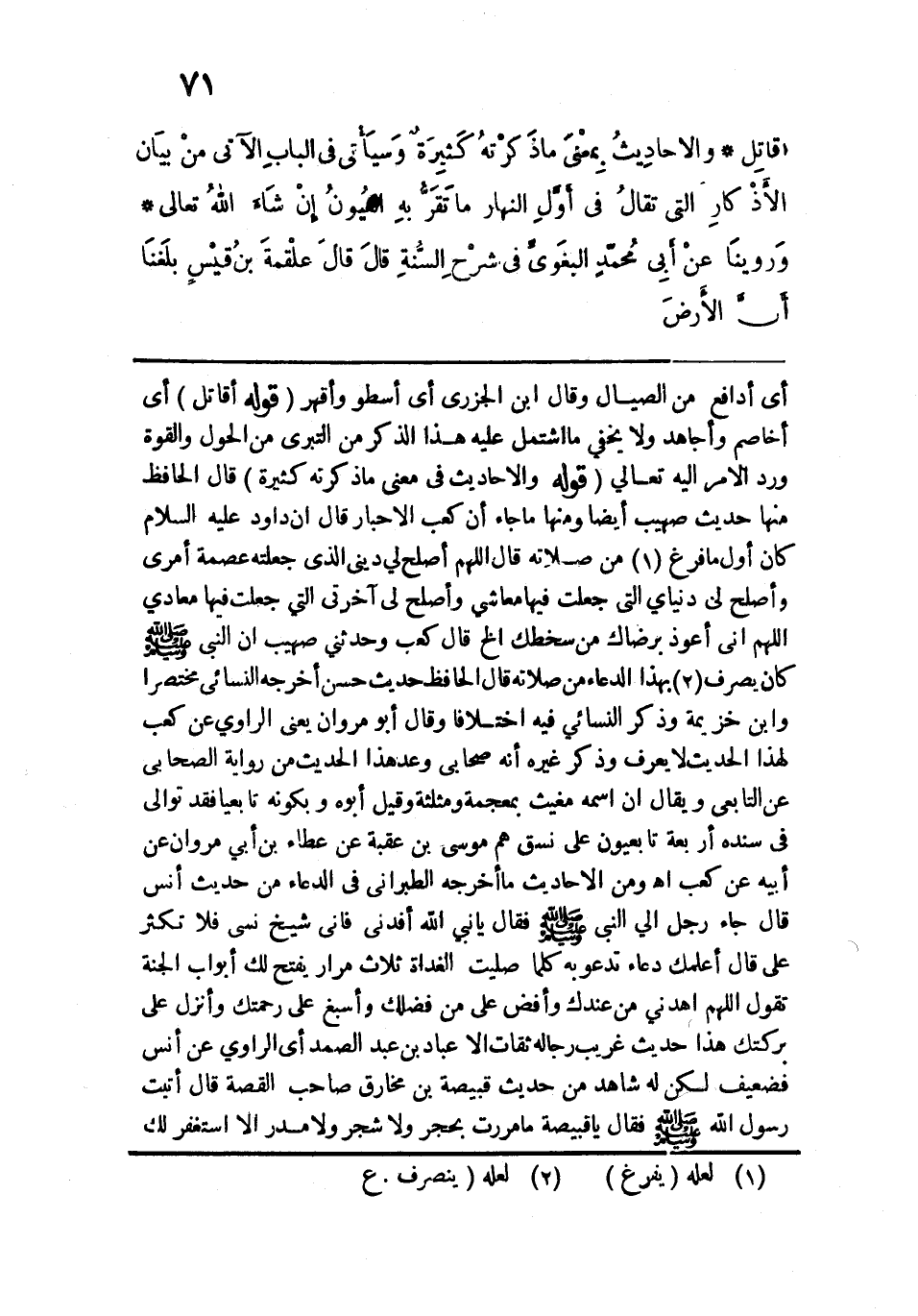 أيضًا ومنها ما جاء أن كعب الأحبار قال أن داود - عليه السلام - كان أول ما فرغ من صلاته قال اللهم أصلح لي ديني الذي جعلته عصمة أمري وأصلح لي دنياي التي جعلت فيها معاشي وأصلح لي آخرتي التي جعلت فيها معادي اللهم إني أعوذ برضاك من سخطك الخ. قال كعب وحدثني صهيب أن النبي - صلى الله عليه وسلم - كان يصرف بهذا الدعاء من صلاته قال الحافظ حديث حسن أخرجه النسائي مختصرًا وابن خزيمة وذكر النسائي فيه اختلافًا وقال أبو مروان يعني الراوي عن كعب لهذا الحديث لا يعرف وذكر غيره أنه صحابي وعد هذا الحديث من رواية الصحابي عن التابعي ويقال أن اسمه مغيث بمعجمة ومثلثة وقيل أبوه وبكونه تابعيًّا فقد توالى في سنده أربعة تابعيون على نسق هم موسى بن عقبة عن عطاء بن أبي مروان عن أبيه عن كعب اهـ، ومن الأحاديث ما أخرجه الطبراني في الدعاء من حديث أنس قال جاء رجل إلى النبي - صلى الله عليه وسلم - فقال يا نبي الله أفدني فإني شيخ نسي فلا تكثر عليّ قال أعلمك دعاء تدعو به كلما صليت الغداة ثلاثة مرار يفتح لك أبواب الجنة تقول اللهم اهدني من عندك وأفض علي من فضلك وأسبغ علي رحمتك وأنزل علي بركتك هذا حديث غريب رجاله ثقات إلَّا عباد بن عبد الصمد أي الراوي عن أنس فضعيف لكن له شاهد من حديث قبيصة بن مخارق صاحب القصة قال أتيت رسول الله - صلى الله عليه وسلم - فقال يا قبيصة ما مررت بحجر ولا شجر ولا مدر إلَّا استغفر لك