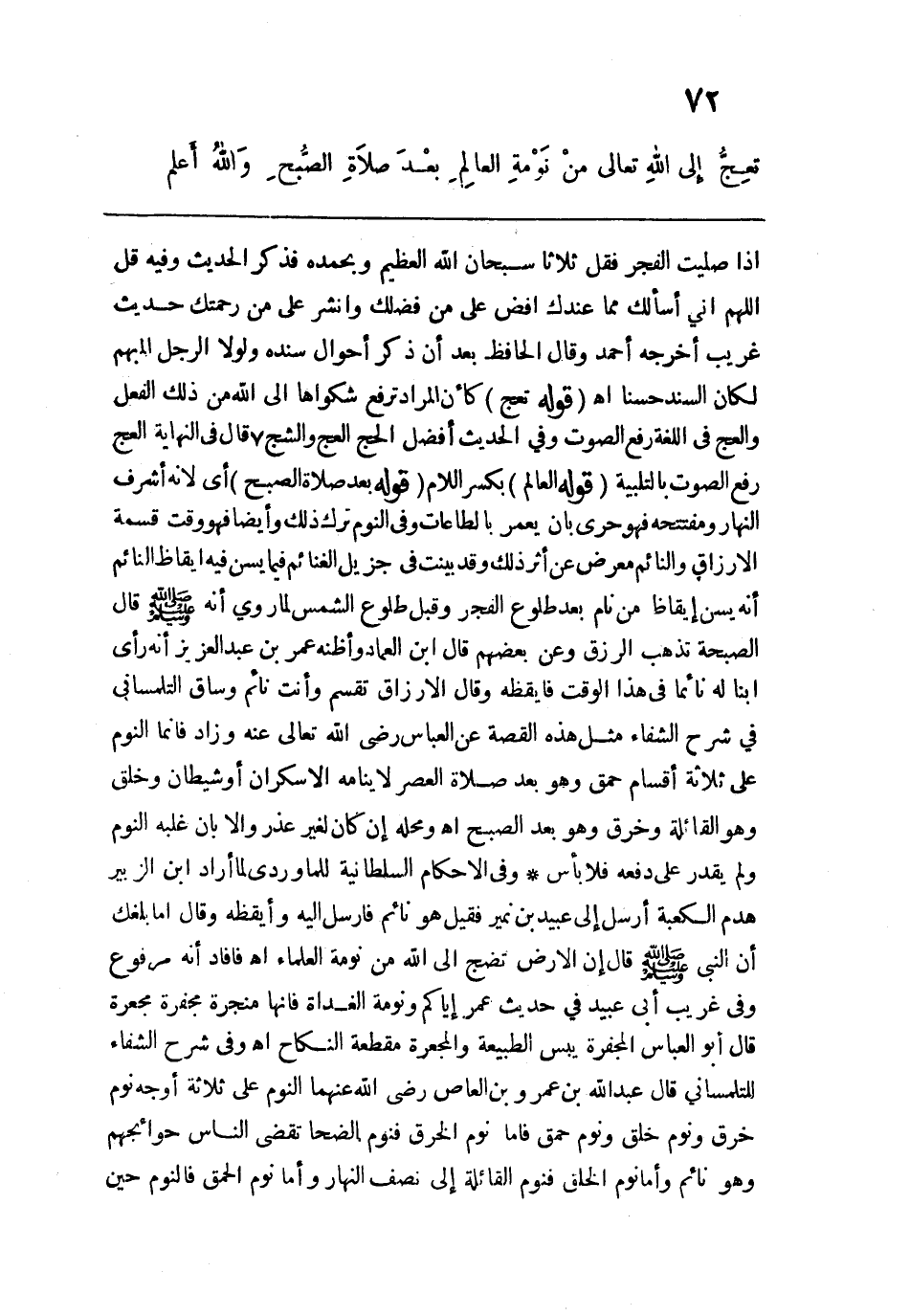 وفي الأحكام السلطانية للماوردي لما أراد ابن الزبير هدم الكعبة أرسل إلى عبيد بن نمير فقيل هو نائم فأرسل إليه وأيقظه وقال أما بلغك أن النبي - صلى الله عليه وسلم - قال إن الأرض تضج إلى الله من نومة العلماء اهـ. فأفاد أنه مرفوع وفي غريب أبي عبيد في حديث عمر إياكم ونومة الغداة فإنها منجرة مجفرة مجعرة قال أبو العباس المجفرة يبس الطبيعة والمجعرة مقطعة النكاح اهـ، وفي شرح الشفاء للتلمساني