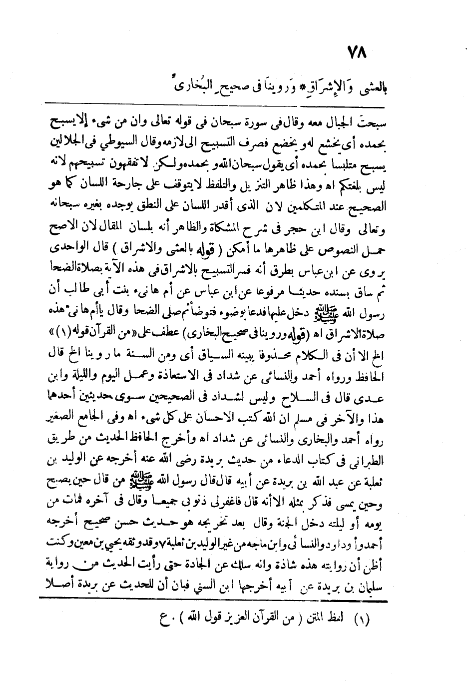 سبحت الجبال معه وقال في سورة سبحان في قوله تعالى ({وَإِنْ مِنْ شَيْءٍ إلا يُسَبِّحُ بِحَمْدِهِ} [الإسراء: 44] أي يخضع له ويخضع فصرف التسبيح إلى لازمه وقال السيوطي في الجلالين يسبح متلبسًا بحمده أي يقول سبحان الله وبحمده ولكن لا تفقهون تسبيحهم لأنه ليس بلغتكم اهـ، وهذا ظاهر التنزيل والتلفظ لا يتوقف على جارحة اللسان كما هو الصحيح عند المتكلمين لأن الذي أقدر اللسان على النطق يوجده بغيره سبحانه وتعالى وقال ابن حجر في شرح المشكاة والظاهر أنه بلسان المقال لأن الأصح حمل النصوص على ظاهرها ما أمكن. قوله: (بالعَشي وَالإشراق) قال الواحدي يروى عن ابن عباس بطرق أنه فسر التسبيح بالإشراق في هذه الآية بصلاة الضحا ثم ساق بسنده حديثًا مرفوعًا عن ابن عباس عن أم هانئ بنت أبي طالب أن رسول الله - صلى الله عليه وسلم - دخل عليها فدعا بوضوء فتوضأ ثم صلى الضحي وقال يا أم هانئ هذه صلاة الإشراق اهـ.