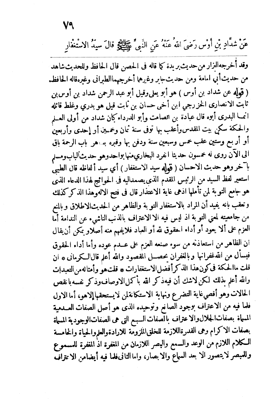 الأنصاري الخزرجي ابن أخي حسان بن ثابت قيل هو بدري وغلط قائله إنما البدري أبوه قال عبادة بن الصامت وأبو الدرداء كان شداد من أولي العلم والحكمة سكن بيت المقدس وأعقب بها توفي سنة ثمان وخمسين أو إحدى وأربعين أو أربع وستين عقب خمس وسبعين سنة ودفن بها وقبره بظاهر باب الرحمة باقٍ إلى الآن روي له خمسون حديثًا انفرد البخاري منها بواحد وهو حديث الباب ومسلم بآخر وهو حديث الإحسان. قوله: (سيدُ الاستغْفارِ) أي سيد ألفاظه قال الطيبي استعير لفظ السيد من الرئيس المقدم الذي يصمد إليه في الحوائج لهذا الدعاء الذي هو جامع التوبة لمن تأملها إذ هي غاية الاعتذار قال في فتح الإله وهذا الذكر كذلك وتعقب بأنه يفيد أن المراد بالاستغفار التوبة والظاهر من الحديث الإطلاق وبالمنع من جامعيته لمعنى التوبة إذ ليس فيه إلّا الاعتراف بالذنب الناشئ عن الندامة أما العزم على ألا يعود أو أداء الحقوق لله أو العباد فلا يفهم منه أصلًا ويمكن أن يقال أن الظاهر من استعاذته من سوء صنعه العزم على عدم عوده وأما أداء الحقوق فيسأل من الله غفرانها وبالغفران يحصل المقصود والله أعلم قال الكرماني.