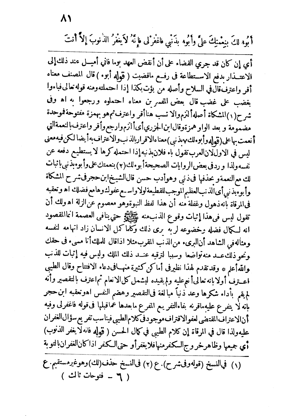 وقد تقدم لهذا نظير في أماكن كثيرة منها في دعاء الافتتاح وقال الطيبي اعترف أولًا بأنه تعالى أنعم عليه ولم يقيده ليشمل كل الأنعام ثم اعترف بالتقصير وأنه لم يفم بأداء شكرها وعد ذنبًا مبالغة في التقصير وهضم النفس اهـ، وتعقبه ابن حجر بأنه لا يتفرع عليه ما قرنه بفاء التفريع المفرع ما بعدها عما قبلها في قوله فاغفر لي وفيه أن الاعتراف المقتضي لعفو الاقتراف موجود في كلام الطيبي فيناسب تفريع سؤال الغفران عليه ولذا قال في المرقاة إن كلام الطيبي في كمال الحسن.
