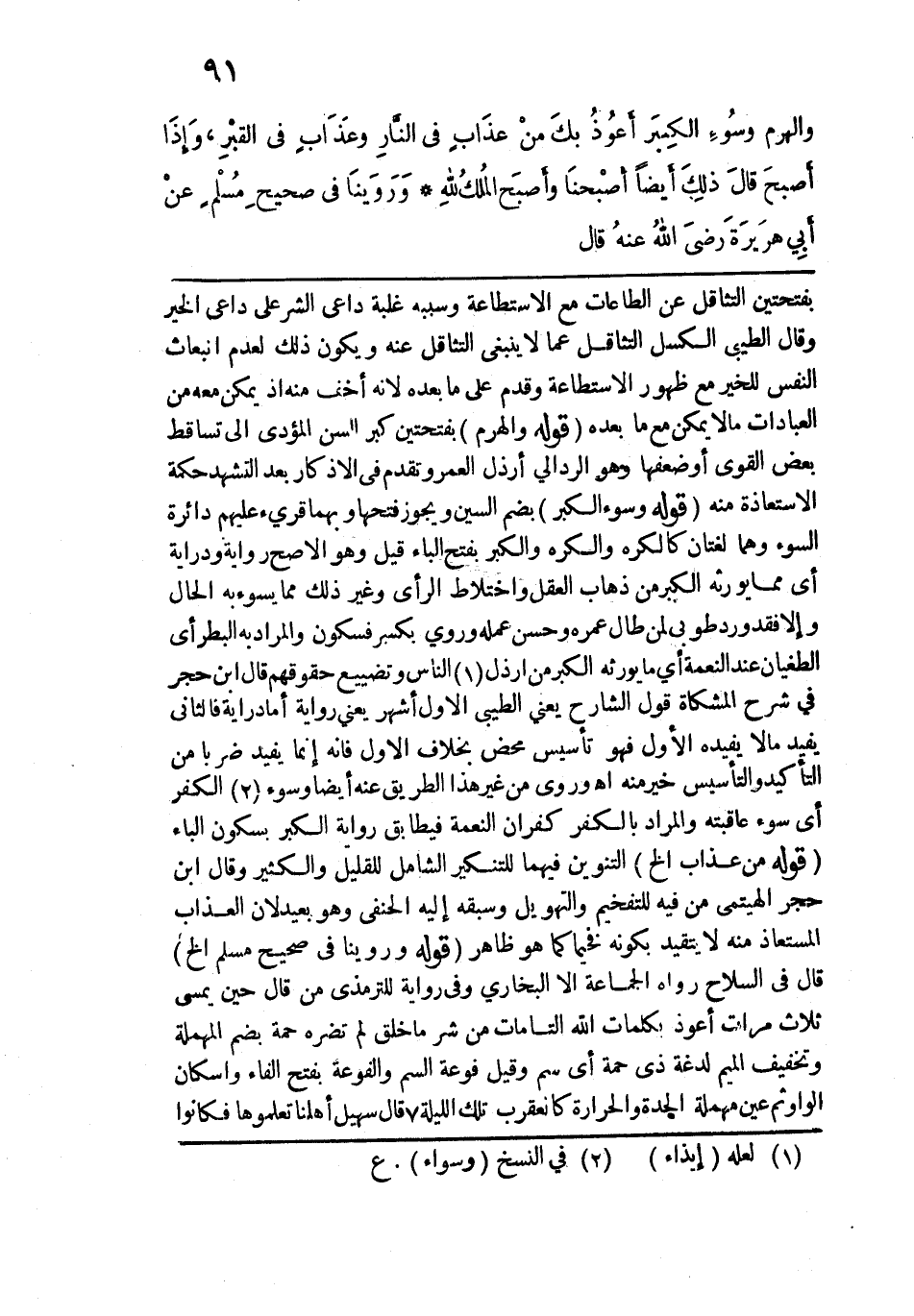 بفتحتين التثاقل عن الطاعات مع الاستطاعة وسببه غلبة داعي الشر على داعي الخير وقال الطيبي الكسل التثاقل عما لا ينبغي التثاقل عنه ويكون ذلك لعدم انبعاث النفس للخير مع ظهور الاستطاعة وقدم على ما بعده لأنه أخف منه إذ يمكن معه من العبادات ما لا يمكن مع ما بعده. قوله: (والهرم) بفتحتين كبر السن المؤدي إلى تساقط بعض القوى أو ضعفها وهو الرد إلى أرذل العمر وتقدم في الأذكار بعد التشهد حكمة الاستعاذة منه. قوله: (وسُوءِ الكِبَر) بضم السين ويجوز فتحها وبهما قرئ عليهم دائرة السوء وهما لغتان كالكره والكره والكبر بفتح الباء قيل وهو الأصح رواية ودراية أي مما يورثه الكبر من ذهاب العقل واختلاط الرأي وغير ذلك مما يسوء به الحال وإلّا فقد ورد طوبى لمن طال عمره وحسن عمله وروي بكسر فسكون والمراد به البطر أي الطغيان عند النعمة أي ما يورثه الكبر من أرذل الناس وتضييع حقوقهم قال ابن حجر في شرح المشكاة قول الشارح يعني الطيبي الأول أشهر يعني رواية أما دراية فالثاني يفيد ما لا يفيده الأول فهو تأسيس محض بخلاف الأول فإنه إنما يفيد ضربًا من التأكيد والتأسيس خير منه اهـ. وروي من غير هذا الطريق عنه أيضًا وسوء الكفر أي سوء عاقبته والمراد بالكفر كفران النعمة فيطابق رواية الكبر بسكون الباء. قوله (منْ عذَاب ألخ) التنوين فيهما للتنكير الشامل للقليل والكثير وقال ابن حجر الهيتمي من فيه للتفخيم والتهويل وسبقه إليه الحنفي وهو بعيد لأن العذاب المستعاذ منه لا يتقيد بكونه فخيما كما هو ظاهر.