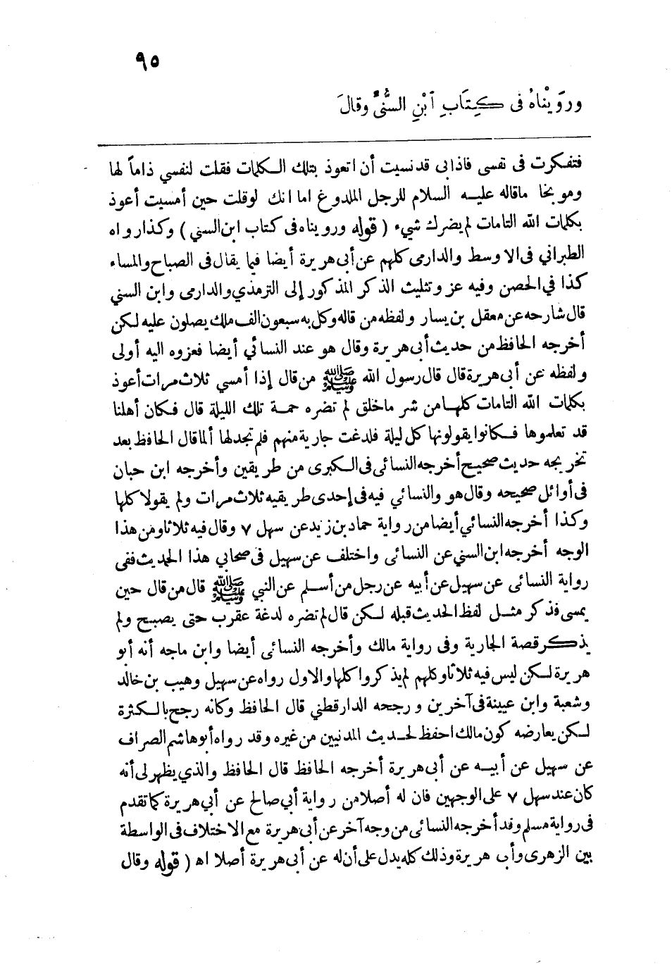 الأوسط والدارمي كلهم عن أبي هريرة أيضًا فيما يقال في الصباح والمساء كذا في الحصين وفيه عز وتثليث الذكر المذكور إلى الترمذي والدارمي وابن السني قال شارحه عن معقل بن يسار ولفظه من قاله وكل به سبعون ألف ملك يصلون عليه لكن أخرجه الحافظ من حديث أبي هريرة وقال هو عند النسائي أيضًا فعزوه إليه أولى ولفظه عن أبي هريرة قال قال رسول الله - صلى الله عليه وسلم - من قال إذا أمسى ثلاث مرات أعوذ بكلمات الله التامات كلها من شر ما خلق لم تضره حمة تلك الليلة قال فكان أهلنا قد تعلموها فكانوا يقولونها كل ليلة فلدغت جارية منهم فلم تجد لها ألمًا قال الحافظ بعد تخريجه حديث صحيح أخرجه النسائي في الكبرى من طريقين وأخرجه ابن حبان في أوائل صحيحه وقال هو والنسائي فيه في إحدى طريقيه ثلاث مرات ولم يقولا كلها وكذا أخرجه النسائي أيضًا من رواية حماد بن زيد عن سهل وقال فيه ثلاثًا ومن هذا الوجه أخرجه ابن السني عن النسائي واختلف عن سهيل في صحابي هذا الحديث ففي رواية النسائي عن سهيل عن أبيه عن رجل من أسلم عن النبي - صلى الله عليه وسلم - قال من قال حين يمسي فذكر مثل لفظ الحديث قبله لكن قال لم تضره لدغة عقرب حتى يصبح ولم يذكر قصة الجارية وفي رواية مالك وأخرجه النسائي أيضًا وابن ماجة أنه أبو هريرة لكن ليس فيه ثلاثًا وكلهم لم يذكروا كلها والأول رواه عن سهيل وهيب بن خالد وشعبة وابن عيينة في آخرين ورجحه الدارقطني قال الحافظ وكأنه رجح بالكثرة لكن يعارضه كون مالك احفظ لحديث المدنيين من غيره وقد رواه أبو هاشم الصراف عن سهيل عن أبيه عن أبي هريرة أخرجه الحافظ قال الحافظ والذي يظهر لي أنه كان عند سهل على الوجهين فإن له أصلًا من رواية أبي صالح عن أبي هريرة كما تقدم في رواية مسلم وقد أخرجه النسائي من وجه آخر عن أبي هريرة مع الاختلاف في الواسطة بين الزهري وأبي هريرة وذلك كله يدل على أنه له عن أبي هريرة أصلًا اهـ. قوله: (وقَال