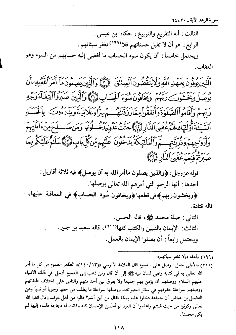 {الذين يوفون بعهد الله ولا ينقضون الميثاق والذين يصلون ما أمر الله به أن يوصل ويخشون ربهم ويخافون سوء الحساب والذين صبروا ابتغاء وجه ربهم وأقاموا الصلاة وأنفقوا من ما رزقناهم سرا وعلانية ويدرؤون بالحسنة السيئة أولئك لهم عقبى الدار جنات عدن يدخلونها ومن صلح من آبائهم وأزواجهم وذرياتهم والملائكة يدخلون عليهم من كل باب سلام عليكم بما صبرتم فنعم عقبى الدار} قوله عز وجل: {والذين يصلون ما أمر الله به أن يوصل} فيه ثلاثة أقاويل: أحدها: أنها الرحم التي أمرهم الله تعالى بوصلها. {ويخشون ربهم} في قطعها {ويخافون سُوءَ الحساب} في المعاقبة عليها , قاله قتادة. الثاني: صلة محمد صلى الله عليه وسلم , قاله الحسن. الثالث: الإيمان بالنبيين والكتب كلها , قاله سعيد بن جبير. ويحتمل رابعاً: أن يصلوا الإيمان بالعمل.