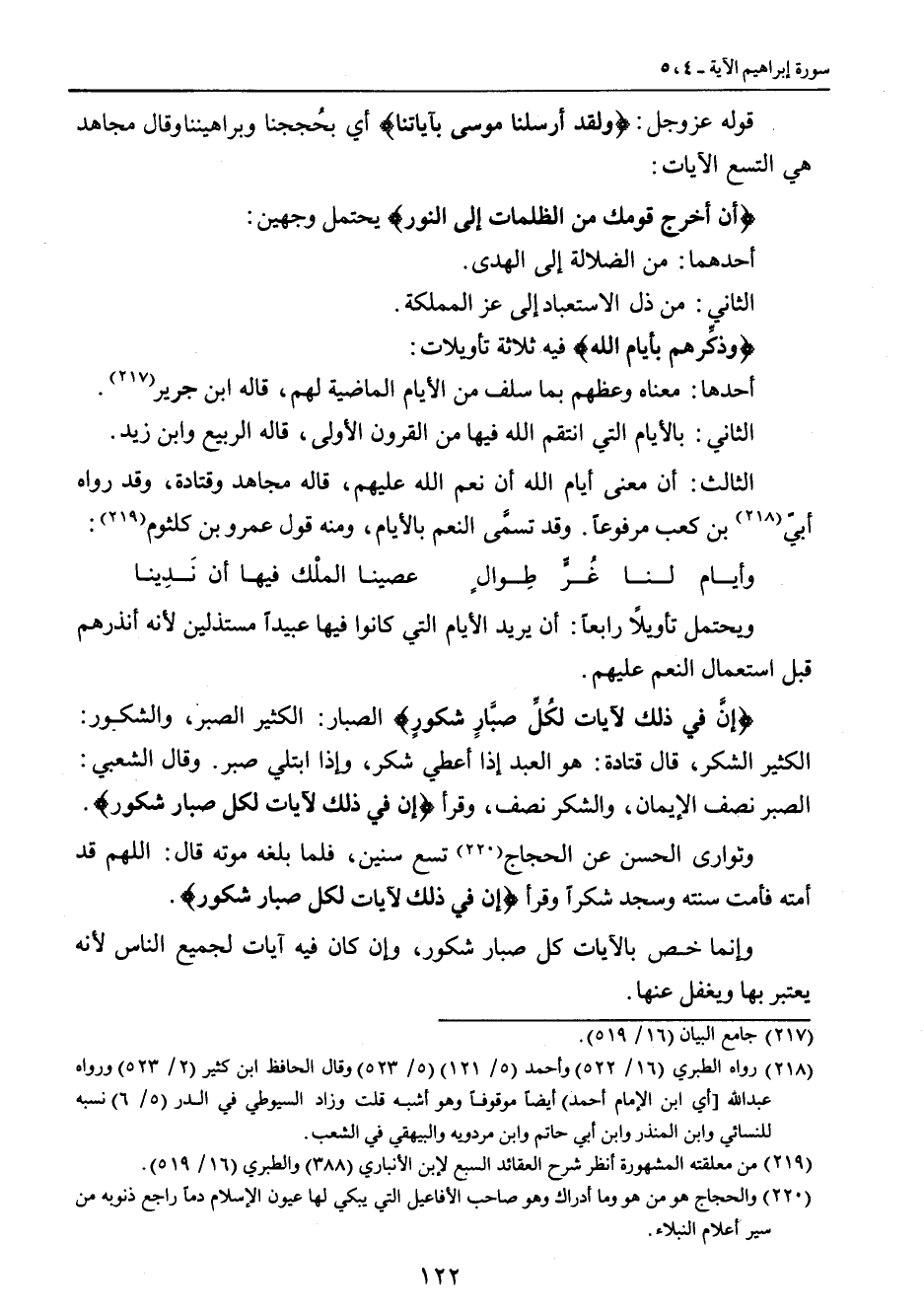ويحتمل تأويلاً رابعاً: أن يريد الأيام التي كانوا فيها عبيداًَ مستذلين لأنه أنذرهم قبل استعمال النعم عليهم. {إنَّ في ذلك لآيات لكُلِّ صبَّارٍ شكورٍ} الصبار: الكثير الصبر , والشكور: الكثير الشكر , قال قتادة: هو العبد إذا أعطي شكر , وإذا ابتلي صبر. وقال الشعبي: الصبر نصف الإيمان , والشكر نصف , وقرأ {إن في ذلك لآيات لكل صبار شكور}. وتوارى الحسن عن الحجاج تسع سنين , فلما بلغه موته قال: اللهم قد أمته فأمت سنته وسجد شكراً وقرأ {إن في ذلك لآيات لكل صبار شكور}. وإنما خص بالآيات كل صبار شكور , وإن كان فيه آيات لجميع الناس لأنه يعتبر بها ويغفل عنها.