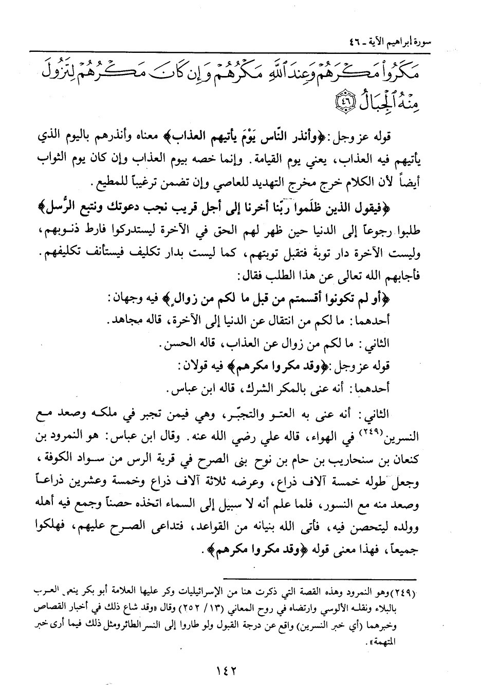 مكروا مكرهم وعند الله مكرهم وإن كان مكرهم لتزول منه الجبال} قوله عز وجل: {وأنذر النّاس يَوْمَ يأتيهم العذاب} معناه وأنذرهم باليوم الذي يأتيهم فيه العذاب , يعني يوم القيامة. وإنما خصه بيوم العذاب وإن كان يوم الثواب أيضاً لأن الكلام خرج مخرج التهديد للعاصي وإن تضمن ترغيباً للمطيع. {فيقول الذين ظلَموا ربّنا أخرنا إلى أجل قريب نجب دعوتك ونتبع الرُّسل} طلبوا رجوعاً إلى الدنيا حين ظهر لهم الحق في الآخرة ليستدركوا فارط ذنوبهم , وليست الآخرة دار توبة فتقبل توبتهم , كما ليست بدار تكليف فيستأنف تكليفهم. فأجابهم الله تعالى عن هذا الطلب فقال: {أو لم تكونوا أقسمتم من قبل ما لكم من زوالٍ} فيه وجهان: أحدهما: ما لكم من انتقال عن الدنيا إلى الآخرة , قاله مجاهد. الثاني: ما لكم من زوال عن العذاب , قاله الحسن. قوله عز وجل: {وقد مكروا مكرهم} فيه قولان: أحدهما: أنه عنى بالمكر الشرك , قاله ابن عباس. الثاني: أنه عنى به العتو والتجبّر , وهي فيمن تجبر في ملكه وصعد مع النسرين في الهواء , قاله علي رضي الله عنه. وقال ابن عباس: هو النمرود بن كنعان بن سنحاريب بن حام بن نوح بنى الصرح في قرية الرس من سواد الكوفة , وجعل طوله خمسة آلاف ذراع , وعرضه ثلاثة آلاف ذراع وخمسة وعشرين ذراعاً وصعد منه مع النسور , فلما علم أنه لا سبيل إلى السماء اتخذه حصناً وجمع فيه أهله وولده ليتحصن فيه , فأتى الله بنيانه من القواعد , فتداعى الصرح عليهم , فهلكوا جميعاً، فهذا معنى قوله {وقد مكروا مكرهم}.