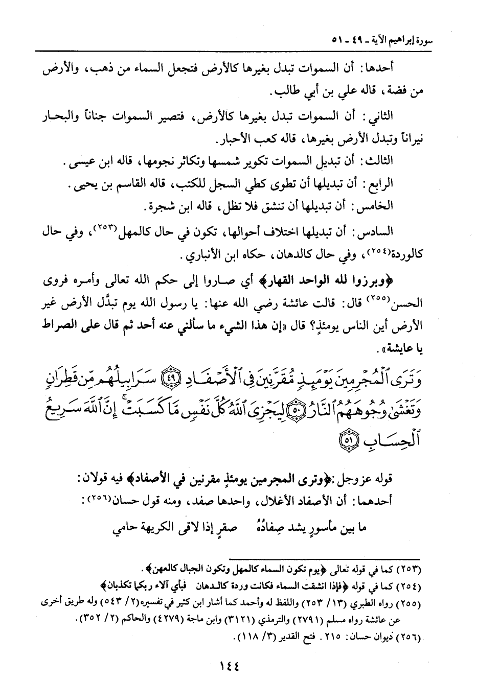 {وترى المجرمين يومئذ مقرنين في الأصفاد سرابيلهم من قطران وتغشى وجوههم النار ليجزي الله كل نفس ما كسبت إن الله سريع الحساب هذا بلاغ للناس ولينذروا به وليعلموا أنما هو إله واحد وليذكر أولوا الألباب} قوله عز وجل: {وترى المجرمين يومئذٍ مقرنين في الأصفاد} فيه قولان: أحدهما: أن الأصفاد الأغلال , واحدها صفد , ومنه قول حسان: