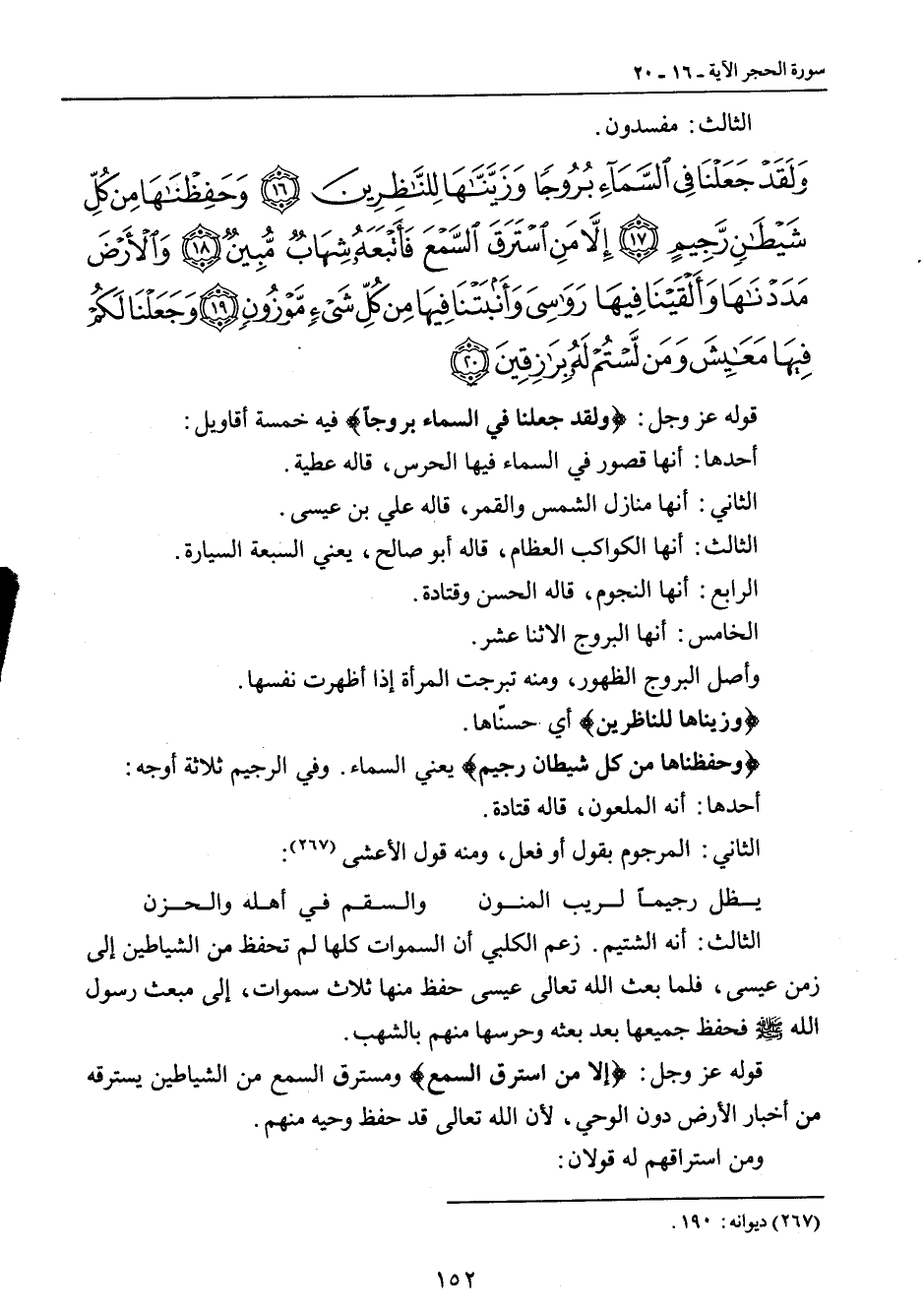 {ولقد جعلنا في السماء بروجا وزيناها للناظرين وحفظناها من كل شيطان رجيم إلا من استرق السمع فأتبعه شهاب مبين والأرض مددناها وألقينا فيها رواسي وأنبتنا فيها من كل شيء موزون وجعلنا لكم فيها معايش ومن لستم له برازقين} قوله عز وجل: {ولقد جعلنا في السماء بروجاً} فيه خمسة أقاويل: أحدها: أنها قصور في السماء فيها الحرس , قاله عطية. الثاني: أنها منازل الشمس والقمر , قاله علي بن عيسى. الثالث: أنها الكواكب العظام , قاله أبو صالح , يعني السبعة السيارة. الرابع: أنها النجوم , قاله الحسن وقتادة. الخامس: أنها البروج الاثنا عشر. وأصل البروج الظهور , ومنه تبرجت المرأة إذا أظهرت نفسها. {وزيناها للناظرين} أي حسنّاها. {وحفظناها من كل شيطان رجيم} يعني السماء. وفي الرجيم ثلاثة أوجه: أحدها: أنه الملعون , قاله قتادة. الثاني: المرجوم بقول أو فعل , ومنه قول الأعشى: