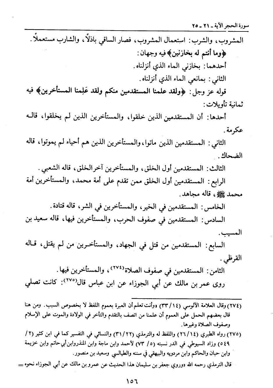 المشروب , والشرب: استعمال المشروب , فصار الساقي باذلاً , والشارب مستعملاً. {وما أنتم له بخازنين} فيه وجهان: أحدهما: بخازني الماء الذي أنزلناه. الثاني: بمانعي الماء الذي أنزلناه. قوله عز وجل: {ولقد علمنا المستقدمين منكم ولقد عَلِمنا المستأخرين} فيه ثمانية تأويلات: أحدها: أن المستقدمين الذين خلقوا , والمستأخرين الذين لم يخلقوا , قاله عكرمة. الثاني: المستقدمين الذين ماتوا , والمستأخرين الذين هم أحياء لم يموتوا , قاله الضحاك. الثالث: المستقدمين أول الخلق , والمستأخرين آخر الخلق , قاله الشعبي. الرابع: المستقدمين أول الخلق ممن تقدم على أمة محمد , والمستأخرين أمة محمد صلى الله عليه وسلم , قاله مجاهد. الخامس: المستقدمين في الخير , والمستأخرين في الشر , قاله قتادة. السادس: المستقدمين في صفوف الحرب , والمستأخرين فيها , قاله سعيد بن المسيب. السابع: المستقدمين من قتل في الجهاد , والمستأخرين من لم يقتل , قاله القرظي. الثامن: المستقدمين في صفوف الصلاة , والمستأخرين فيها. روى عمر بن مالك عن أبي الجوزاء عن ابن عباس قال: كانت تصلي