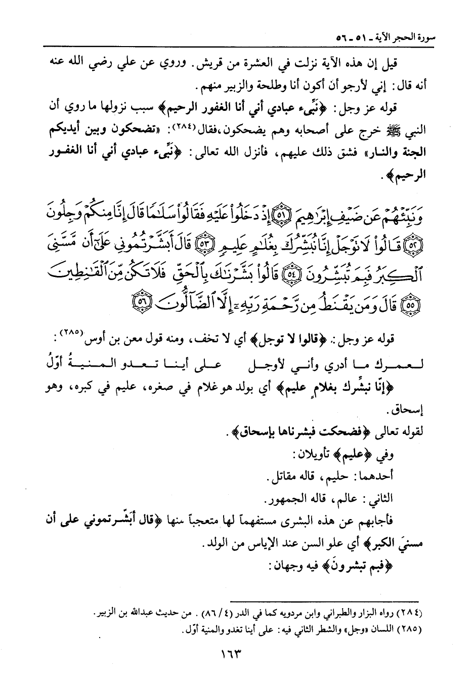 {إنّا نبشِّرك بغلامٍ عليم} أي بولد هو غلام في صغره , عليم في كبره , وهو إسحاق. لقوله تعالى {فضحكت فبشرناها بإسحاق}. وفي {عليم} تأويلان: أحدهما: حليم , قاله مقاتل. الثاني: عالم , قاله الجمهور. فأجابهم عن هذه البشرى مستفهماً لها متعجباً منها {قال أبَشّرتموني على أن مسنيَ الكبر} أي علو السن عند الإياس من الولد. {فبم تبشرونَ} فيه وجهان: