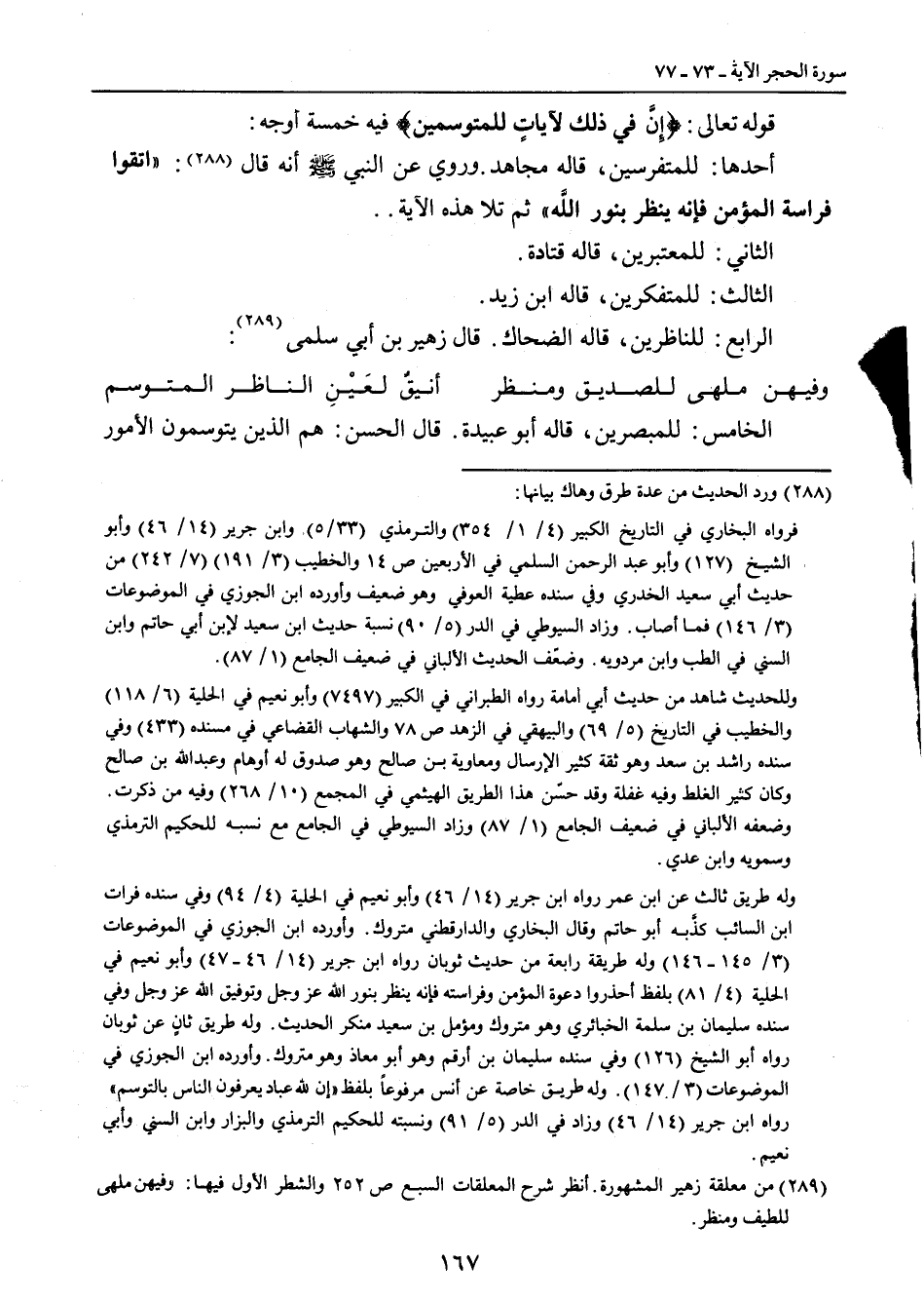 قوله تعالى: {إنَّ في ذلك لآياتٍ للمتوسمين} فيه خمسة أوجه: أحدها: للمتفرسين , قاله مجاهد. وروي عن النبي صلى الله عليه وسلم أنه قال: (اتقوا فراسة المؤمن فإنه ينظر بنور الله) ثم تلا هذه الآية ... الثاني: للمعتبرين , قاله قتادة. الثالث: للمتفكرين , قاله ابن زيد. الرابع: للناظرين , قاله الضحاك. قال زهير بن أبي سلمى: