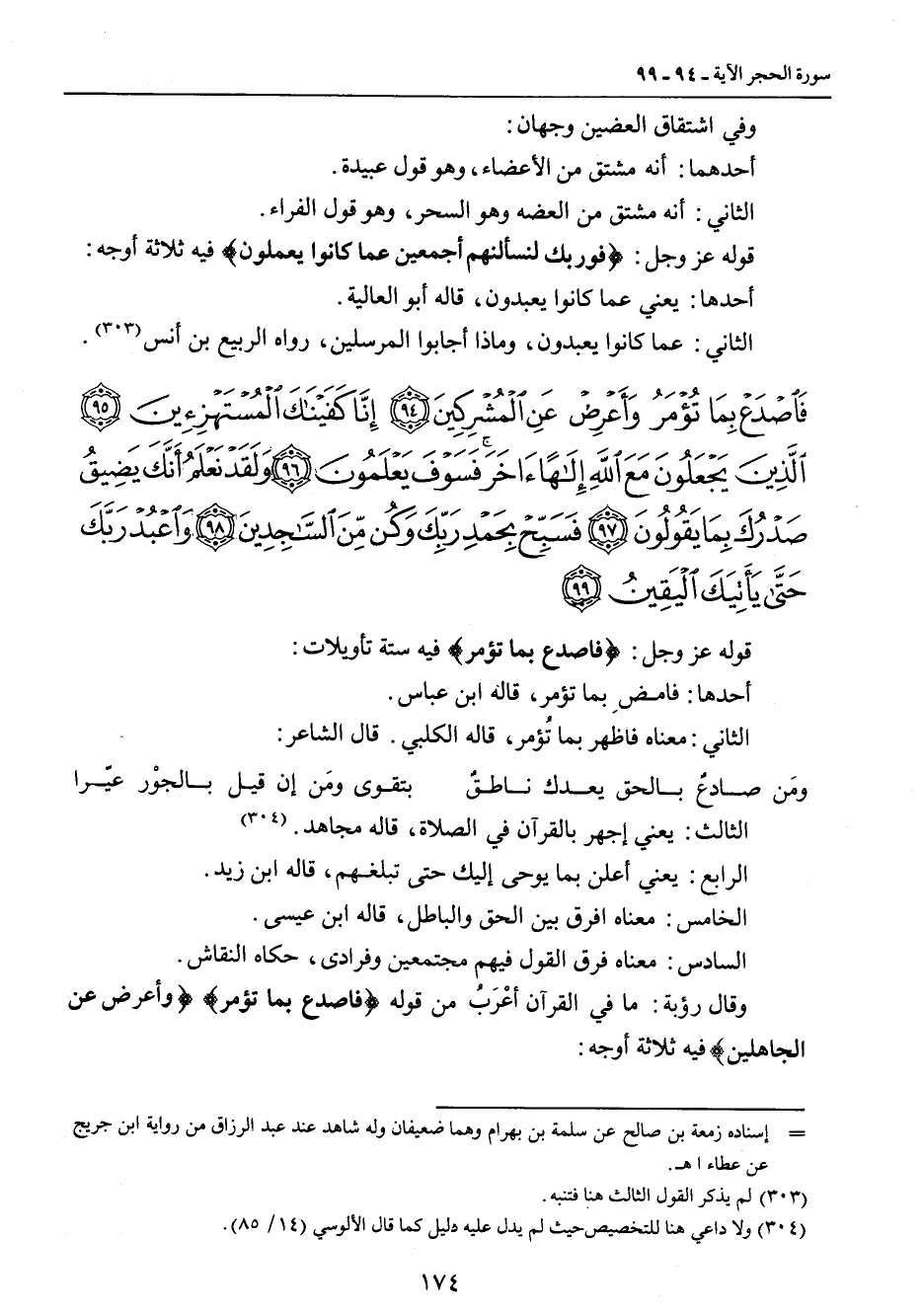 وفي اشتقاق العضين وجهان: أحدهما: أنه مشتق من الأعضاء , وهو قول عبيدة. الثاني: أنه مشتق من العضه وهو السحر , وهو قول الفراء. قوله عز وجل: {فوربك لنسألنهم أجمعين عما كانوا يعملون} فيه ثلاثة أوجه: أحدها: يعني عما كانوا يعبدون , قاله أبو العالية. الثاني: عما كانوا يعبدون , وماذا أجابوا المرسلين , رواه الربيع بن أنس.