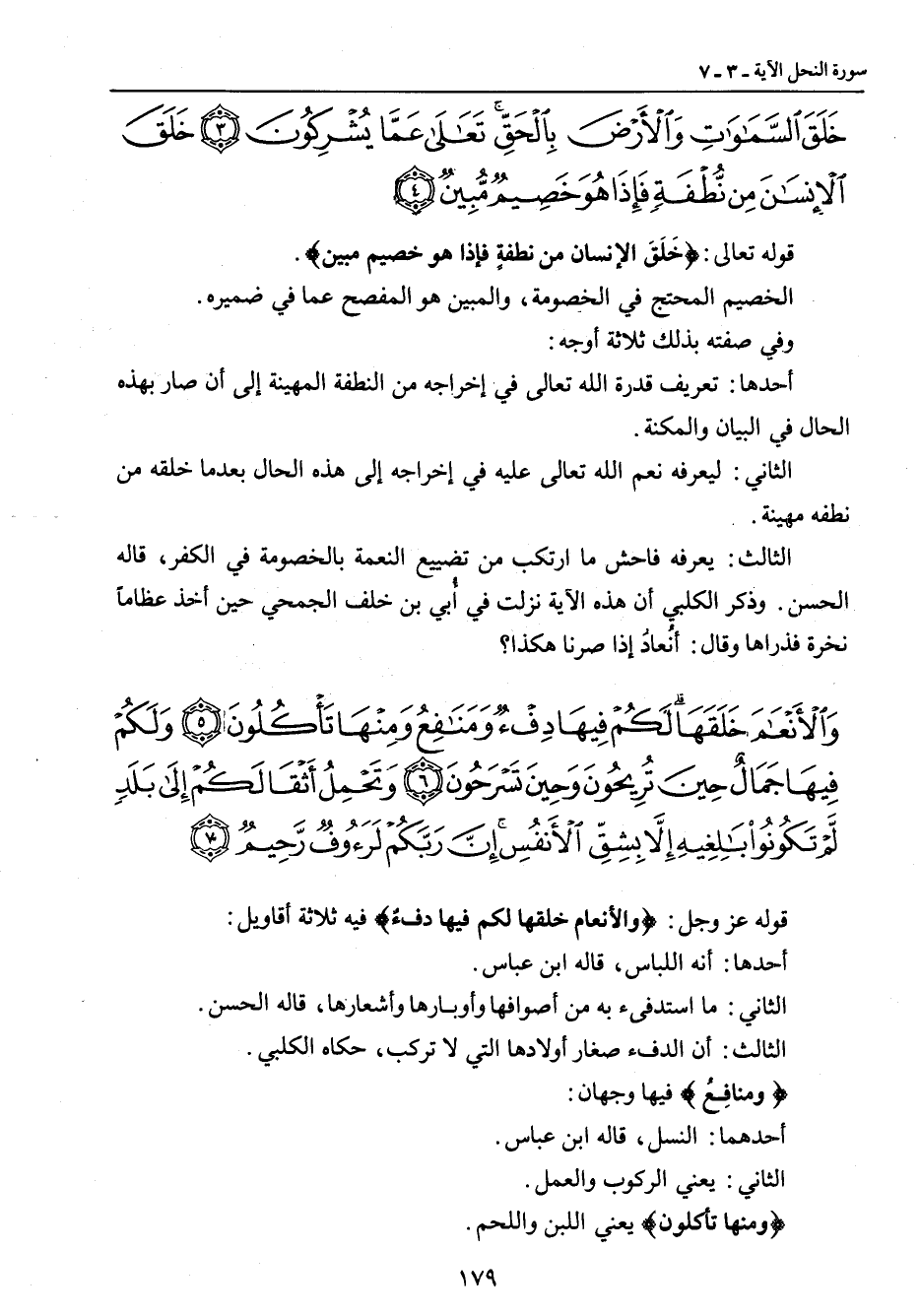 {خلق السماوات والأرض بالحق تعالى عما يشركون خلق الإنسان من نطفة فإذا هو خصيم مبين والأنعام خلقها لكم فيها دفء ومنافع ومنها تأكلون ولكم فيها جمال حين تريحون وحين تسرحون وتحمل أثقالكم إلى بلد لم تكونوا بالغيه إلا بشق الأنفس إن ربكم لرؤوف رحيم} قوله تعالى: {خَلَقَ الإنسان من نطفةٍ فإذا هو خصيم مبين}. الخصيم المحتج في الخصومة , والمبين هو المفصح عما في ضميره. وفي صفته بذلك ثلاثة أوجه: أحدها: تعريف قدرة الله تعالى في إخراجه من النطفة المهينة إلى أن صار بهذه الحال في البيان والمكنة. الثاني: ليعرفه نعم الله تعالى عليه في إخراجه إلى هذه الحال بعدما خلقه من نطفة مهينة. الثالث: يعرفه فاحش ما ارتكب من تضييع النعمة بالخصومة في الكفر , قاله الحسن. وذكر الكلبي أن هذه الآية نزلت في أُبي بن خلف الجمحي حين أخذ عظاماً نخرة فذراها وقال: أنُعادُ إذا صرنا هكذا. قوله عز وجل: {والأنعام خلقها لكم فيها دفءٌ} فيه ثلاثة أقاويل: أحدها: أنه اللباس , قاله ابن عباس. الثاني: ما ستدفىء به من أصوافها وأوبارها وأشعارها , قاله الحسن. الثالث: أن الدفء صغار أولادها التي لا تركب , حكاه الكلبي. {ومنافِعُ} فيها وجهان: أحدهما: النسل , قاله ابن عباس. الثاني: يعني الركوب والعمل. {ومنها تأكلون} يعني اللبن واللحم.
