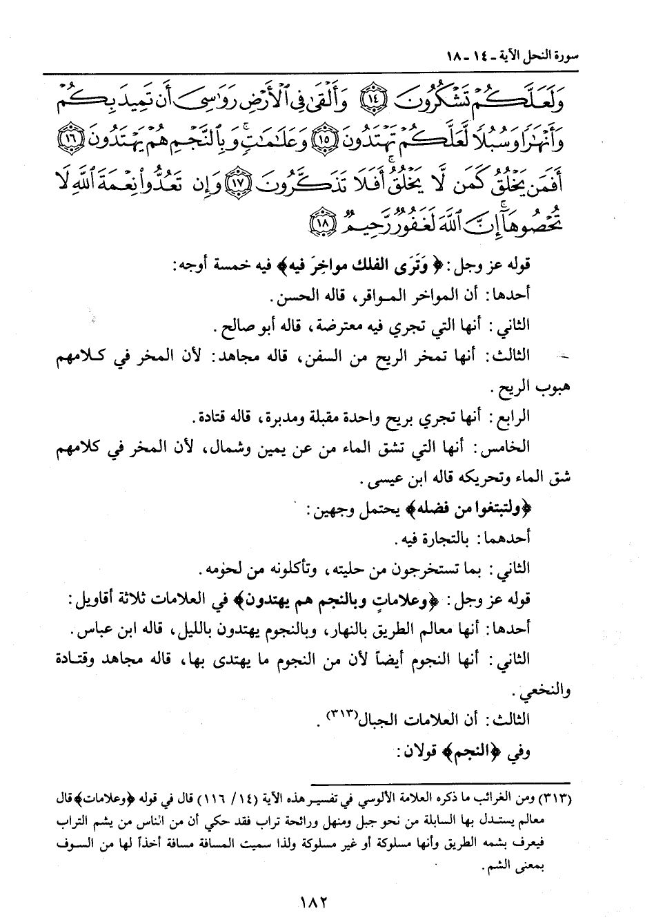ولعلكم تشكرون وألقى في الأرض رواسي أن تميد بكم وأنهارا وسبلا لعلكم تهتدون وعلامات وبالنجم هم يهتدون أفمن يخلق كمن لا يخلق أفلا تذكرون وإن تعدوا نعمة الله لا تحصوها إن الله لغفور رحيم} قوله عز وجل: {وَتَرَى الفلك مواخِرَ فيه} فيه خمسة أوجه: أحدها: أن المواخر المواقر , قاله الحسن. الثاني: أنها التي تجري فيه معترضة , قاله أبو صالح. الثالث: أنها تمخر الريح من السفن , قاله مجاهد: لأن المخر في كلامهم هبوب الريح. الرابع: أنها تجري بريح واحدة مقبلة ومدبرة , قاله قتادة. الخامس: أنها التي تشق الماء من عن يمين وشمال , لأن المخر في كلامهم شق الماء وتحريكه قاله ابن عيسى. {ولتبتغوا من فضله} يحتمل وجهين: أحدهما: بالتجارة فيه. الثاني: بما تستخرجون من حليته , وتأكلونه من لحومه. قوله عز وجل: {وعلاماتٍ وبالنجم هم يهتدون} في العلامات ثلاثة أقاويل: أحدها: أنها معالم الطريق بالنهار , وبالنجوم يهتدون بالليل , قاله ابن عباس. الثاني: أنها النجوم أيضاً لأن من النجوم ما يهتدي بها , قاله مجاهد وقتادة والنخعي. الثالث: أن العلامات الجبال. وفي {النجم} قولان: