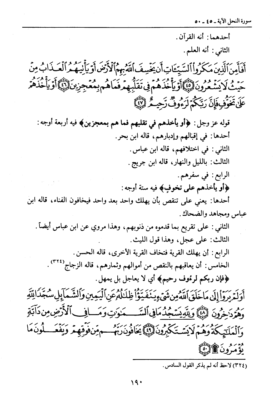 {أفأمن الذين مكروا السيئات أن يخسف الله بهم الأرض أو يأتيهم العذاب من حيث لا يشعرون أو يأخذهم في تقلبهم فما هم بمعجزين أو يأخذهم على تخوف فإن ربكم لرؤوف رحيم} قوله عز وجل: {أو يأخذهم في تقلبهم فما هم بمعجزين} فيه أربعة أوجه: أحدها: في إقبالهم وإدبارهم , قاله ابن بحر. الثاني: في اختلافهم , قاله ابن عباس. الثالث: بالليل والنهار , قاله ابن جريج. الرابع: في سفرهم. {أو يأخذهم على تخوفٍ} فيه ستة أوجه: أحدها: يعني على تنقص بأن يهلك واحد بعد واحد فيخافون الفناء , قاله ابن عباس ومجاهد والضحاك. الثاني: على تقريع بما قدموه من ذنوبهم , وهذا مروي عن ابن عباس أيضاً. الثالث: على عجل , وهذا قول الليث. الرابع: أن يهلك القرية فتخاف القرية الأخرى , قاله الحسن. الخامس: أن يعاقبهم بالنقص من أموالهم وثمارهم , قاله الزجاج. {فإن ربكم لرءُوف رحيم} أي لا يعاجل بل يمهل.