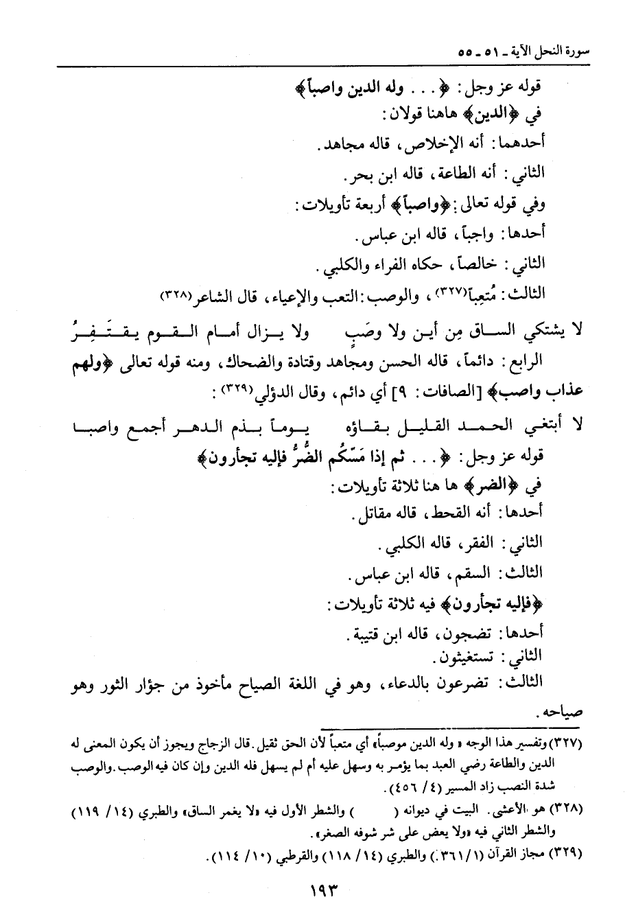 قوله تعالى: { ... وله الدين واصباً} في {الدين} ها هنا قولان: أحدهما: أنه الإخلاص , قاله مجاهد. الثاني: أنه الطاعة , قاله ابن بحر. وفي قوله تعالى: {واصباً} أربعة تأويلات: أحدها: واجباً , قاله ابن عباس. الثاني: خالصاً , حكاه الفراء والكلبي. الثالث: مُتعِباً , والوصب: التعب والإعياء , قال الشاعر: