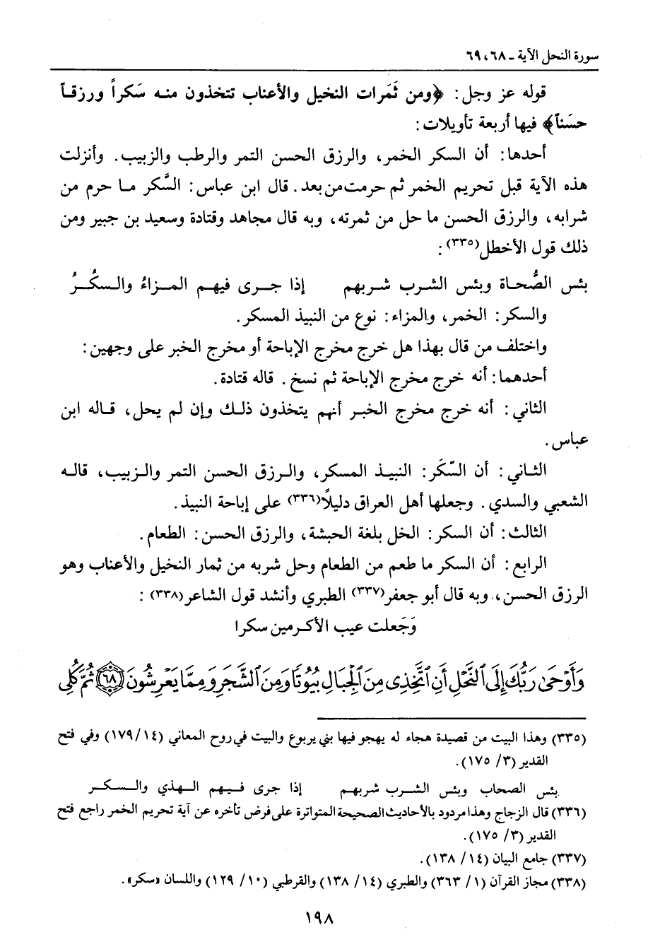 قوله عز وجل: {ومن ثَمَرات النخيل والأعناب تتخذون منه سَكراً ورزقاً حسَناً} فيها أربعة تأويلات: أحدها: أن السكر الخمر , والرزق الحسن التمر والرطب والزبيب. وأنزلت هذه الآية قبل تحريم الخمر ثم حرمت من بعد. قال ابن عباس: السَّكر ما حرم من شرابه , والرزق الحسن ما حل من ثمرته , وبه قال مجاهد وقتادة وسعيد بن جبير ومن ذلك قول الأخطل:
