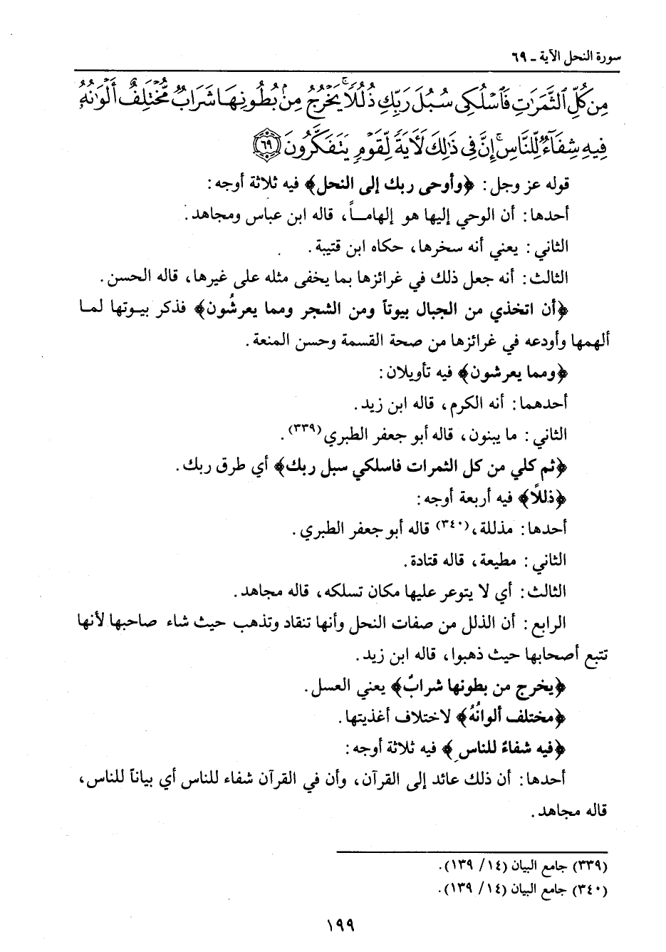 من كل الثمرات فاسلكي سبل ربك ذللا يخرج من بطونها شراب مختلف ألوانه فيه شفاء للناس إن في ذلك لآية لقوم يتفكرون} قوله عز وجل: {وأوحى ربك إلى النحل} فيه ثلاثة أوجه: أحدها: أن الوحي إليها هو إلهاماً , قاله ابن عباس ومجاهد. الثاني: يعني أنه سخرها , حكاه ابن قتيبة. الثالث: أنه جعل ذلك في غرائزها بما يخفى مثله على غيرها , قاله الحسن. {أن اتخذي من الجبال بيوتاً ومن الشجر ومما يعرشُون} فذكر بيوتها لما ألهمها وأودعه في غرائزها من صحة القسمة وحسن المنعة. {ومما يعرشون} فيه تأويلان: أحدهما: أنه الكرم , قاله ابن زيد. الثاني: ما يبنون , قاله أبو جعفر الطبري. {ثم كلي من كل الثمرات فاسلكي سبل ربك} أي طرق ربك. {ذللاً} فيه أربعة أوجه: أحدها: مذللة , قاله أبو جعفر الطبري. الثاني: مطيعة , قاله قتادة. الثالث: أي لا يتوعر عليها مكان تسلكه , قاله مجاهد. الرابع: أن الذلل من صفات النحل وأنها تنقاد وتذهب حيث شاء صاحبها لأنها تتبع أصحابها حيث ذهبوا , قاله ابن زيد. {يخرج من بطونها شرابٌ} يعني العسل. {مختلف ألوانُهُ} لاختلاف أغذيتها. {فيه شفاءٌ للناس} فيه ثلاثة أوجه: أحدها: أن ذلك عائد إلى القرآن، وأن في القرآن شفاء للناس أي بياناً للناس، قاله مجاهد.