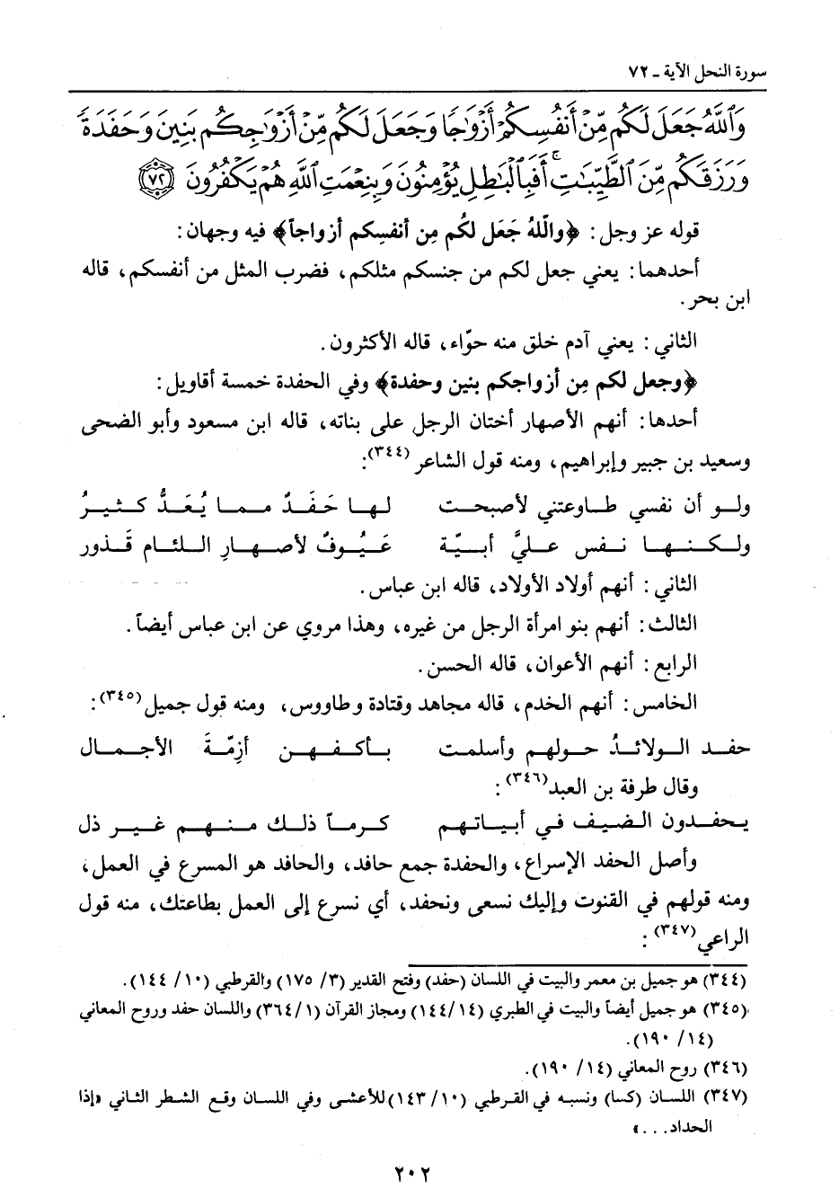 {والله جعل لكم من أنفسكم أزواجا وجعل لكم من أزواجكم بنين وحفدة ورزقكم من الطيبات أفبالباطل يؤمنون وبنعمة الله هم يكفرون} قوله عز وجل: {والّلهُ جَعَل لكُم مِن أنفسِكم أزواجاً} فيه وجهان: أحدهما: يعني جعل لكم من جنسكم مثلكم , فضرب المثل من أنفسكم , قاله ابن بحر. الثاني: يعني آدم خلق منه حوّاء , قاله الأكثرون. {وجعل لكم مِن أزواجكم بنين وحفدة} وفي الحفدة خمسة أقاويل: أحدها: أنهم الأصهار أختان الرجل على بناته , قاله ابن مسعود وأبو الضحى. وسعيد بن جبير وإبراهيم , ومنه قول الشاعر: