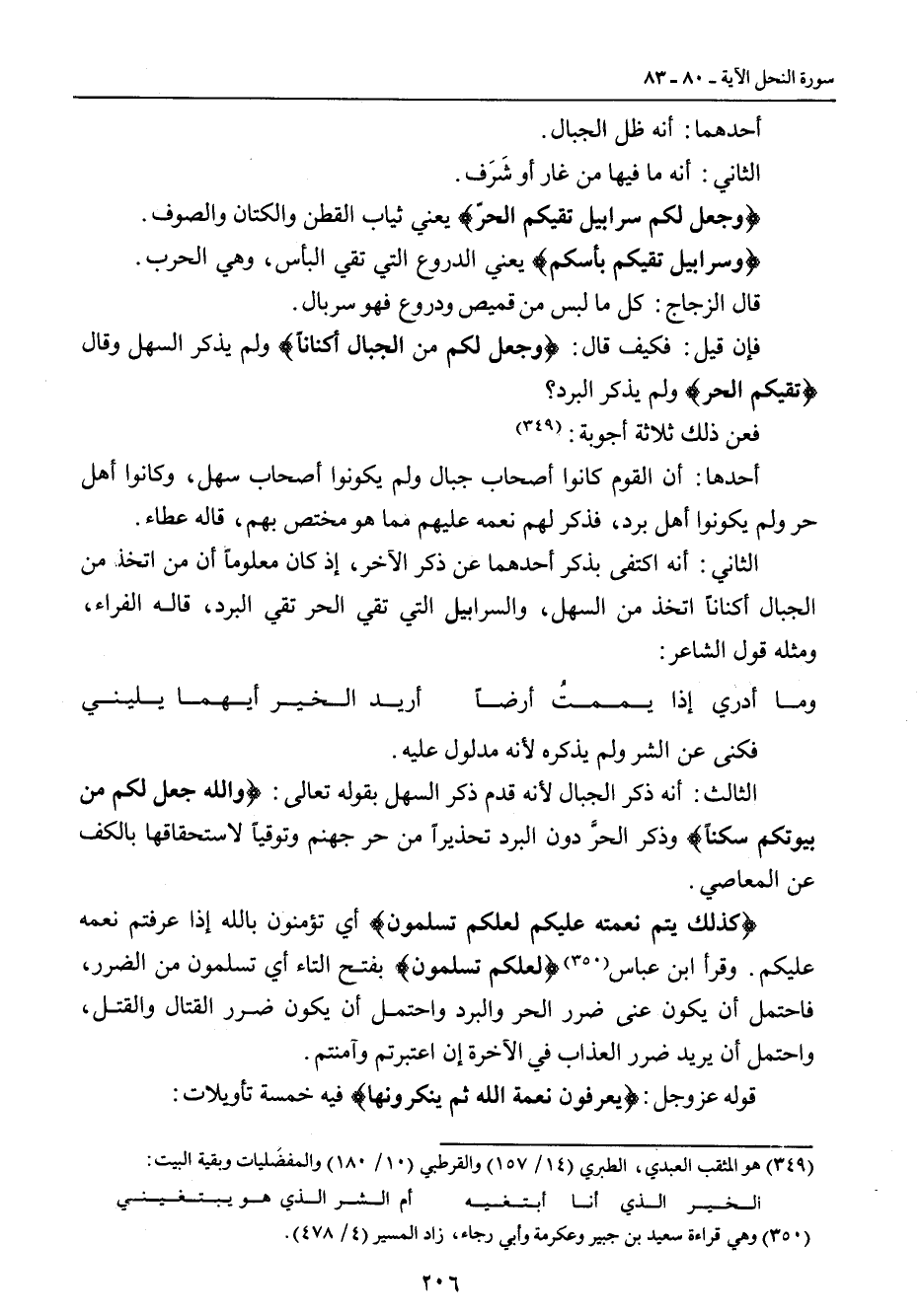 أحدهما أنه ظل الجبال. الثاني: أنه ما فيها من غار أو شَرَف. {وجعل لكم سرابيل تقيكم الحرّ} يعني ثياب القطن والكتان والصوف. {وسرابيل تقيكم بأسكم} يعني الدروع التي تقي البأس , وهي الحرب. قال الزجاج: كل ما لبس من قميص ودروع فهو سربال. فإن قيل: فكيف قال: {وجعل لكم من الجبال أكناناً} ولم يذكر السهل وقال {تقكيم الحر} ولم يذكر البرد؟ فعن ذلك ثلاثة أجوبة: أحدها: أن القوم كانوا أصحاب جبال ولم يكونوا أصحاب سهل , وكانوا أهل حر ولم يكونوا أهل برد , فذكر لهم نعمه عليه مما هو مختص بهم , قاله عطاء. الثاني: أنه اكتفى بذكر احدهما عن ذكر الآخر , إذ كان معلوماً أن من اتخذ من الجبال أكناناً اتخذ من السهل , واسرابيل التي تقي الحر تقي البرد , قاله الفراء , ومثله قول الشاعر:
