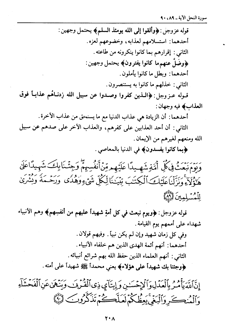 {ويوم نبعث في كل أمة شهيدا عليهم من أنفسهم وجئنا بك شهيدا على هؤلاء ونزلنا عليك الكتاب تبيانا لكل شيء وهدى ورحمة وبشرى للمسلمين} قوله عز وجل: {ويوم نبعث في كل أمةٍ شهيداً عليهم من أنفسِهم} وهم الأنبياء شهداء على أممهم يوم القيامة وفي كل زمان شهيد وإن لم يكن نبياً. وفيهم قولان: أحدهما: أنهم أئمة الهدى الذين هم خلفاء الأنبياء. الثاني: أنهم العلماء الذين حفظ الله بهم شرائع أنبيائه. {وجئنا بك شهيداً على هؤلاء} يعني محمداً صلى الله عليه وسلم شهيداً على أمته.