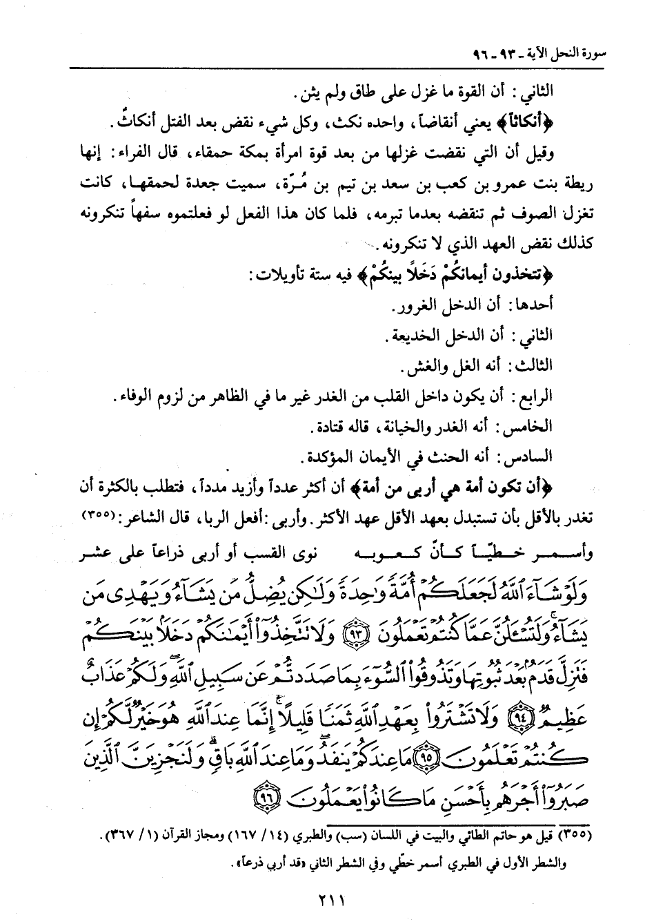الثاني: أن القوة ما غزل على طاق ولم يثن. {أنكاثاً} يعني أنقاضاً , واحده نكث , وكل شيء نقض بعد الفتل أنكاثٌ. وقيل أن التي نقضت غزلها من بعد قوة امرأة بمكة حمقاء , قال الفراء: إنها ريطة بنت عمرو بن كعب بن سعد بن تيم بن مُرّة , سميت جعدة لحمقها , كانت تغزل الصوف ثم تنقضه بعدما تبرمه , فلما كان هذا الفعل لو فعلتموه سفهاً تنكرونه كذلك نقض العهد الذي لا تنكرونه. {تتخذون أيمانكُمْ دَخَلاً بينكُمْ} فيه ستة تأويلات: أحدها: أن الدخل الغرور. الثاني: أن الدخل الخديعة. الثالث: أنه الغل والغش. الرابع: أن يكون داخل القلب من الغدر غير ما في الظاهر من لزوم الوفاء. الخامس: أنه الغدر والخيانة , قاله قتادة. السادس: أنه الحنث في الأيمان المؤكدة. {أن تكون أمة هي أربى من أمة} أن أكثر عدداً وأزيد مدداً , فتطلب بالكثرة أن تغدر بالأقل بأن تستبدل بعهد الأقل عهد الأكثر. وأربى: أفعل الربا , قال الشاعر: