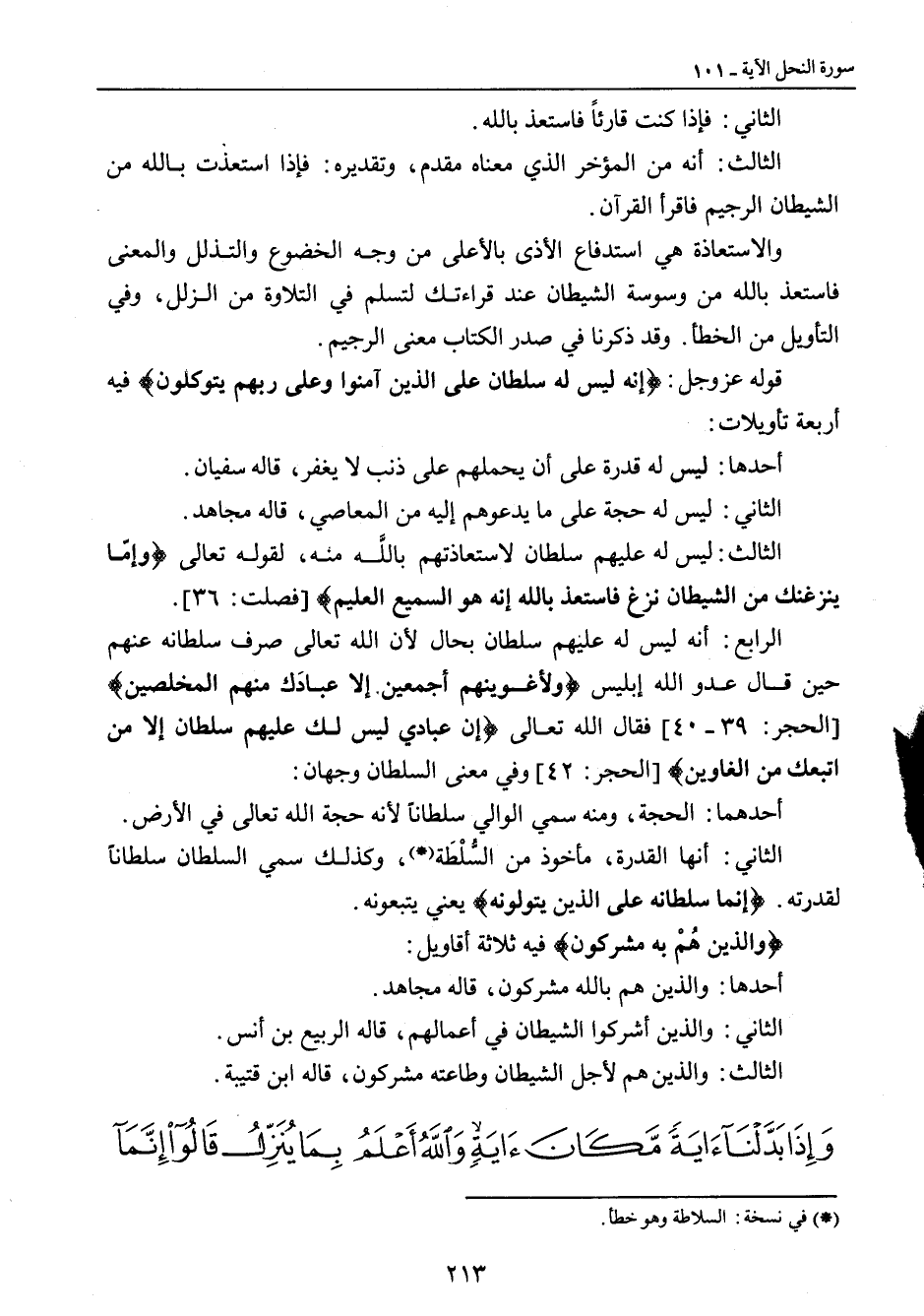 الثاني: فإذا كنت قارئاً فاستعذ بالله. الثالث: أنه من المؤخر الذي معناه مقدم , وتقديره: فإذا استعذت بالله من الشيطان الرجيم فاقرأ القرآن. والاستعاذة هي استدفاع الأذى بالأعلى من وجه الخضوع والتذلل والمعنى فاستعذ بالله من وسوسة الشيطان عند قراءتك لتسلم في التلاوة من الزلل , وفي التأويل من الخطأ. وقد ذكرنا في صدر الكتاب معنى الرجيم. قوله عز وجل: {إنه ليس له سلطان على الذين آمنوا وعلى ربهم يتوكلون} فيه أربعة تأويلات: أحدها: ليس له قدرة على أن يحملهم على ذنب لا يغفر , قاله سفيان. الثاني: ليس له حجة على ما يدعوهم إليه من المعاصي , قاله مجاهد. الثالث: ليس له عليهم سلطان لاستعاذتهم باللَّه منه , لقوله تعالى {وإمّا ينزغنك من الشيطان نزغ فاستعذ بالله إنه هو السميع العليم} [فصلت: 36]. الرابع: أنه ليس له عليهم سلطان بحال لأن الله تعالى صرف سلطانه عنهم حين قال عدو الله إبليس {ولأغوينهم أجميعن إلا عبادَك منهم المخلصين} [الحجر: 39 - 40] فقال الله تعالى {إن عبادي ليس لك عليهم سلطان إلا من اتبعك من الغاوين} [الحجر: 42] وفي معنى السلطان وجهان: أحدهما: الحجة , ومنه سمي الوالي سلطاناً لأنه حجة الله تعالى في الأرض. الثاني: أنها القدرة , مأخوذ من السُّلْطَة , وكذلك سمي السلطان سلطاناً لقدرته. {إنما سلطانه على الذين يتولونه} يعني يتبعونه. {والذين هُمْ به مشركون} فيه ثلاثة أقاويل: أحدها: والذين هم بالله مشركون , قاله مجاهد. الثاني: والذين أشركوا الشيطان في أعمالهم , قاله الربيع بن أنس. الثالث: والذين هم لأجل الشيطان وطاعته مشركون , قاله ابن قتيبة.