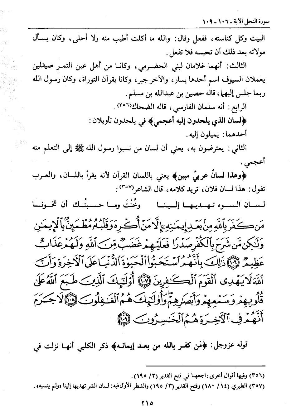 البيت وكل كناسته، ففعل وقال: والله ما أكلت أطيب منه ولا أحلى، وكان يسأل مولاته بعد ذلك أن تحبسه فلا تفعل. الثالث: أنهما غلامان لبني الحضرمي , وكانا من أهل عين التمر صيقلين يعملان السيوف اسم أحدها يسار , والآخر جبر , وكانا يقرآن التوراة , وكان رسول الله ربما جلس إليهما , قاله حصين بن عبد الله بن مسلم. الرابع: أنه سلمان الفارسي , قاله الضحاك. {لسان الذي يلحدون إليه أعجمي} في يلحدون تأويلان: أحدهما: يميلون إليه. الثاني: يعترضون به , يعني أن لسان من نسبوا رسول الله صلى الله عليه وسلم إلى التعلم منه أعجمي. {وهذا لسانٌ عربيٌ مبين} يعني باللسان القرآن لأنه يقرأ باللسان , والعرب تقول: هذا لسان فلان , تريد كلامه , قال الشاعر: