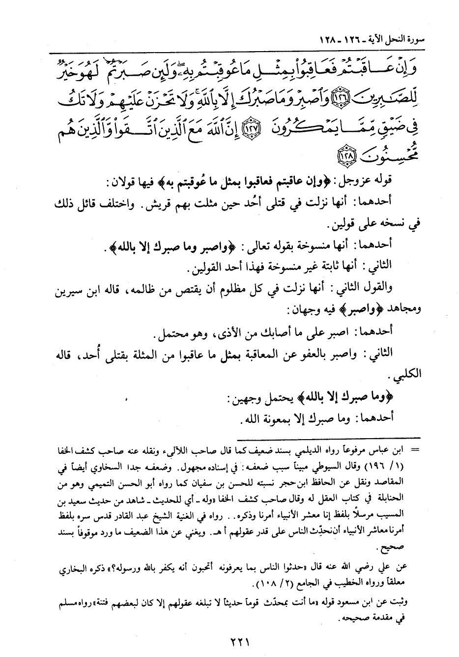 {وإن عاقبتم فعاقبوا بمثل ما عوقبتم به ولئن صبرتم لهو خير للصابرين واصبر وما صبرك إلا بالله ولا تحزن عليهم ولا تك في ضيق مما يمكرون إن الله مع الذين اتقوا والذين هم محسنون} قوله عز وجل: {وإن عاقبتم فعاقبوا بمثل ما عُوقبتم به} فيها قولان: أحدهما: أنها نزلت في قتلى أحُد حين مثلت بهم قريش. واختلف قائل ذلك في نسخه على قولين: أحدهما: أنها منسوخة بقوله تعالى: {واصبر وما صبرك إلا بالله} الثاني: أنها ثابتة غير منسوخة فهذا أحد القولين. والقول الثاني: أنها نزلت في كل مظلوم ان يقتص من ظالمه , قاله ابن سيرين ومجاهد {واصبر} فيه وجهان: أحدهما: اصبر على ما أصابك من الأذى , وهو محتمل. الثاني: واصبر بالعفو عن المعاقبة بمثل ما عاقبوا من المثلة بقتلى أُحد , قاله الكلبي. {وما صبر إلا بالله} يحتمل وجهين: أحدهما: وما صبر إلا بمعونة الله.