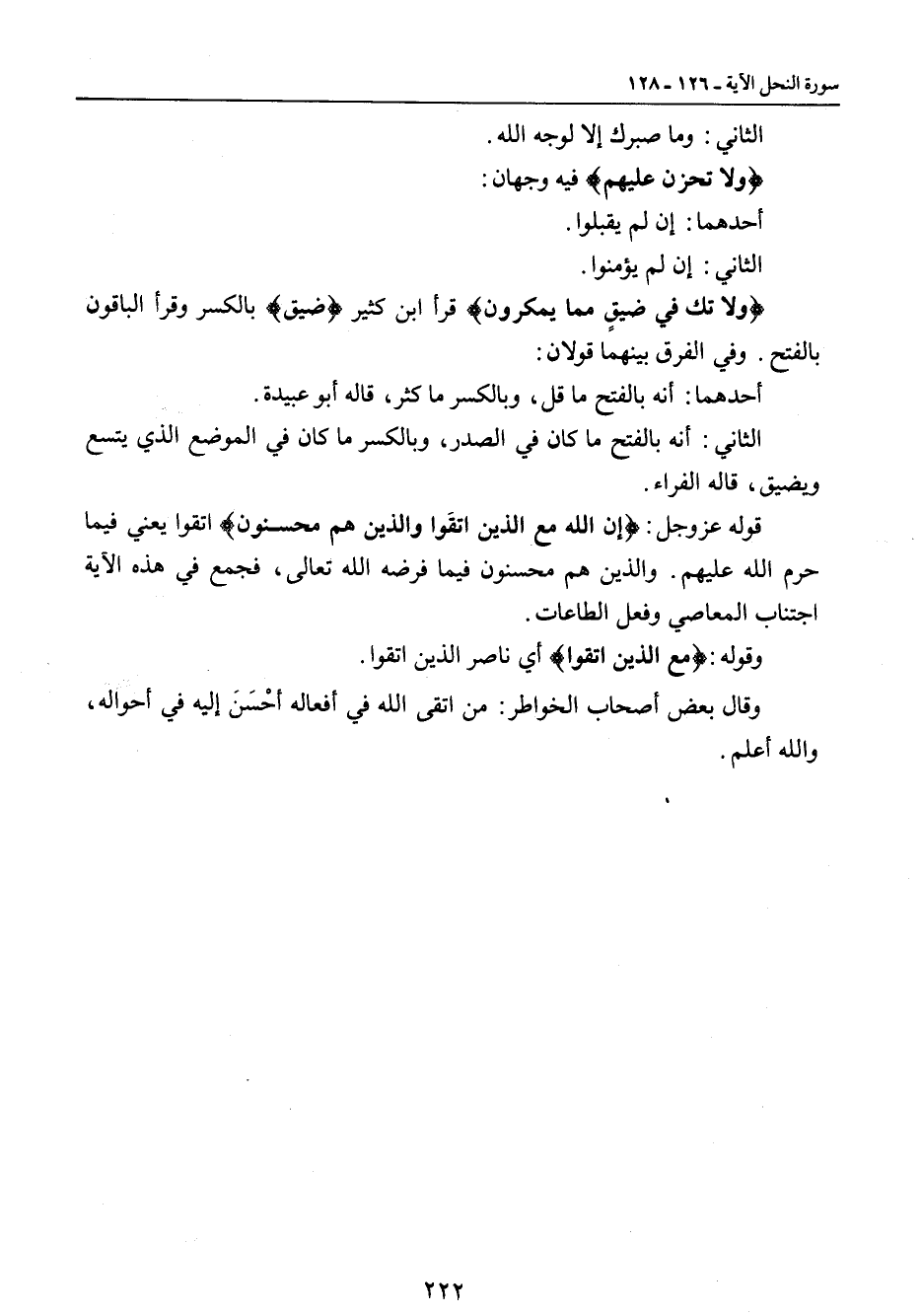 الثاني: وما صبرك إلا لوجه الله. {ولا تحزن عليهم} فيه وجهان: أحدهما: إن لم يقبلوا. الثاني: إن لم يؤمنوا. {ولا تك في ضيقٍ مما يمكرون} قرأ بن كثير {ضيق} بالكسر وقرأ الباقون بالفتح. وفي الفرق بينهما قولان: أحدهما: أنه بالفتح ما قل , وبالكسر ما كثر , قاله أبو عبيدة. الثاني: أنه بالفتح ما كان في الصدر، وبالكسر ما كان في الموضع الذي يتسع ويضيق، قاله الفراء. قوله عز وجل: {إن الله مع الذين اتقوا والذين هم محسنون} اتقوا يعني فيما حرم الله عليهم. والذين هم محسنون فيما فرضه الله تعالى، فجمع في هذه الآية اجتناب المعاصي وفعل الطاعات. وقوله: {مع الذين اتقوا} أي ناصر الذي اتقوا. وقال بعض أصحاب الخواطر: من اتقى الله في أفعاله أحْسَنَ إليه في أحواله، والله أعلم.