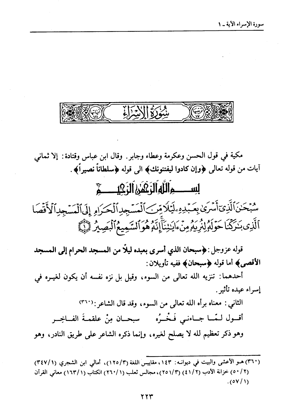 {سبحان الذي أسرى بعبده ليلا من المسجد الحرام إلى المسجد الأقصى الذي باركنا حوله لنريه من آياتنا إنه هو السميع البصير} قوله عز وجل: {سبحان الذي أسرى بعبده ليلاً من المسجد الحرام إلى المسجد الأقصى} أما قوله {سبحان} ففيه تأويلان: أحدهما: تنزيه الله تعالى من السوء , وقيل بل نزه نفسه أن يكون لغيره في إسراء عبده تأثير. الثاني: معناه برأه الله تعالى من السوء , وقد قال الشاعر: