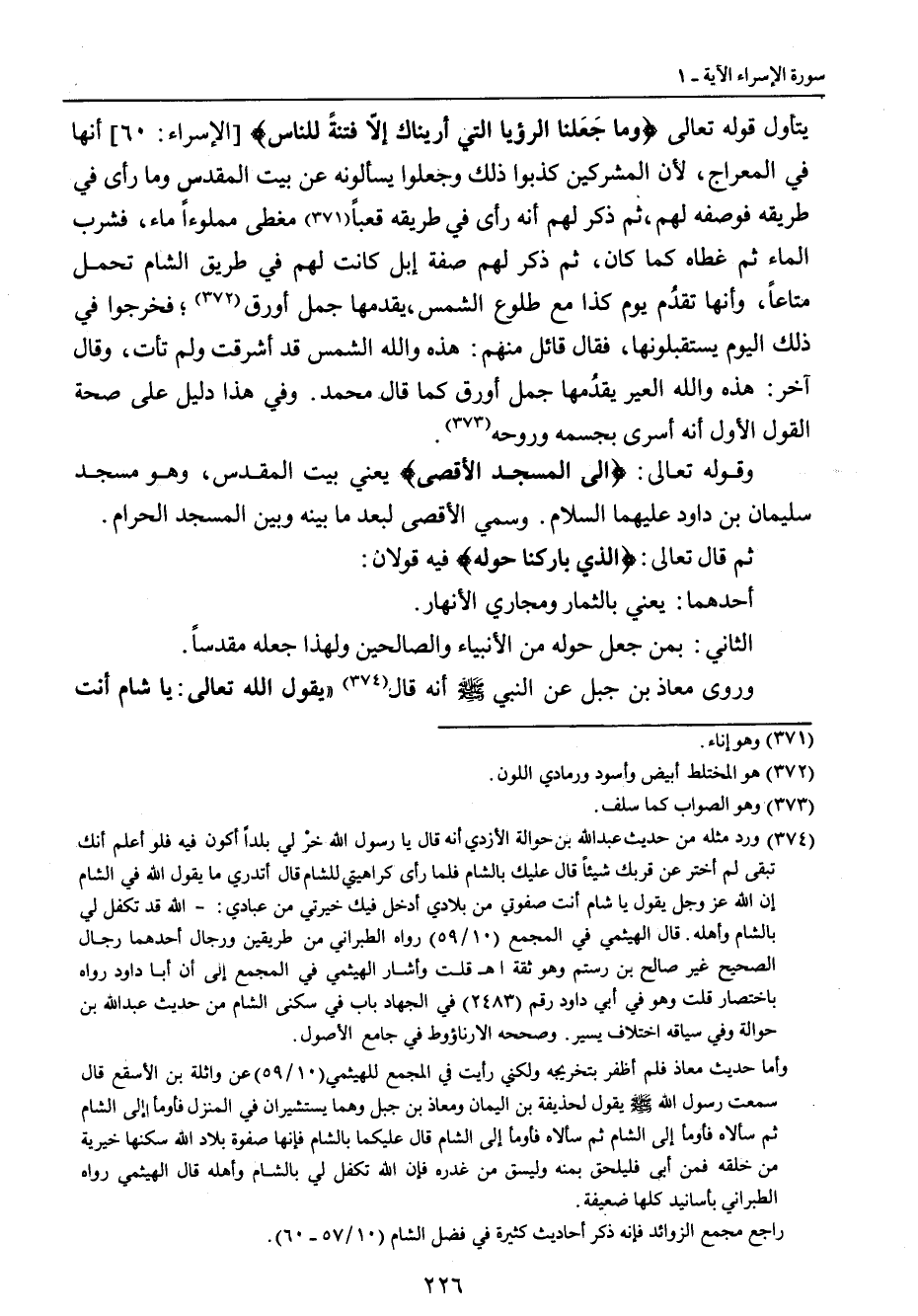 يتأول قوله تعالى {وما جَعَلنا الرؤيا التي أريناك إلاّ فتنةً للناس} [الإسراء: 60] أنها في المعراج , لأن المشركين كذبوا ذلك وجعلوا يسألونه عن بيت المقدس وما رأى في طريقه فوصفه لهم , ثم ذكر لهم أنه رأى في طريقه قعباً مغطى مملوءاً ماء , فشرب الماء ثم غطاه كما كان , ثم ذكر لهم صفة إبل كانت لهم في طريق الشام تحمل متاعاً , وأنها تقدُم يوم كذا مع طلوع الشمس , يقدمها جمل أورق؛ فخرجوا في ذلك اليوم يستقبلونها , فقال قائل منهم: هذه والله الشمس قد أشرقت ولم تأت , وقال آخر: هذه والله العير يقدُمها جمل أورق كما قال محمد. وفي هذا دليل على صحة القول الأول أنه أسرى بجسمه وروحه. وقوله تعالى: {إلى المسجد الأقصى} يعني بيت المقدس , وهو مسجد سليمان بن داود عليهما السلام وسمي الأقصى لبعد ما بينه وبين المسجد الحرام. ثم قال تعالى: {الذي باركنا حوله} فيه قولان: أحدهما: يعني بالثمار ومجاري الأنهار. الثاني: بمن جعل حوله من الأنبياء والصالحين ولهذا جعله مقدساً. وروى معاذ بن جبل عن النبي صلى الله عليه وسلم أنه قال (يقول الله تعالى: يا شام