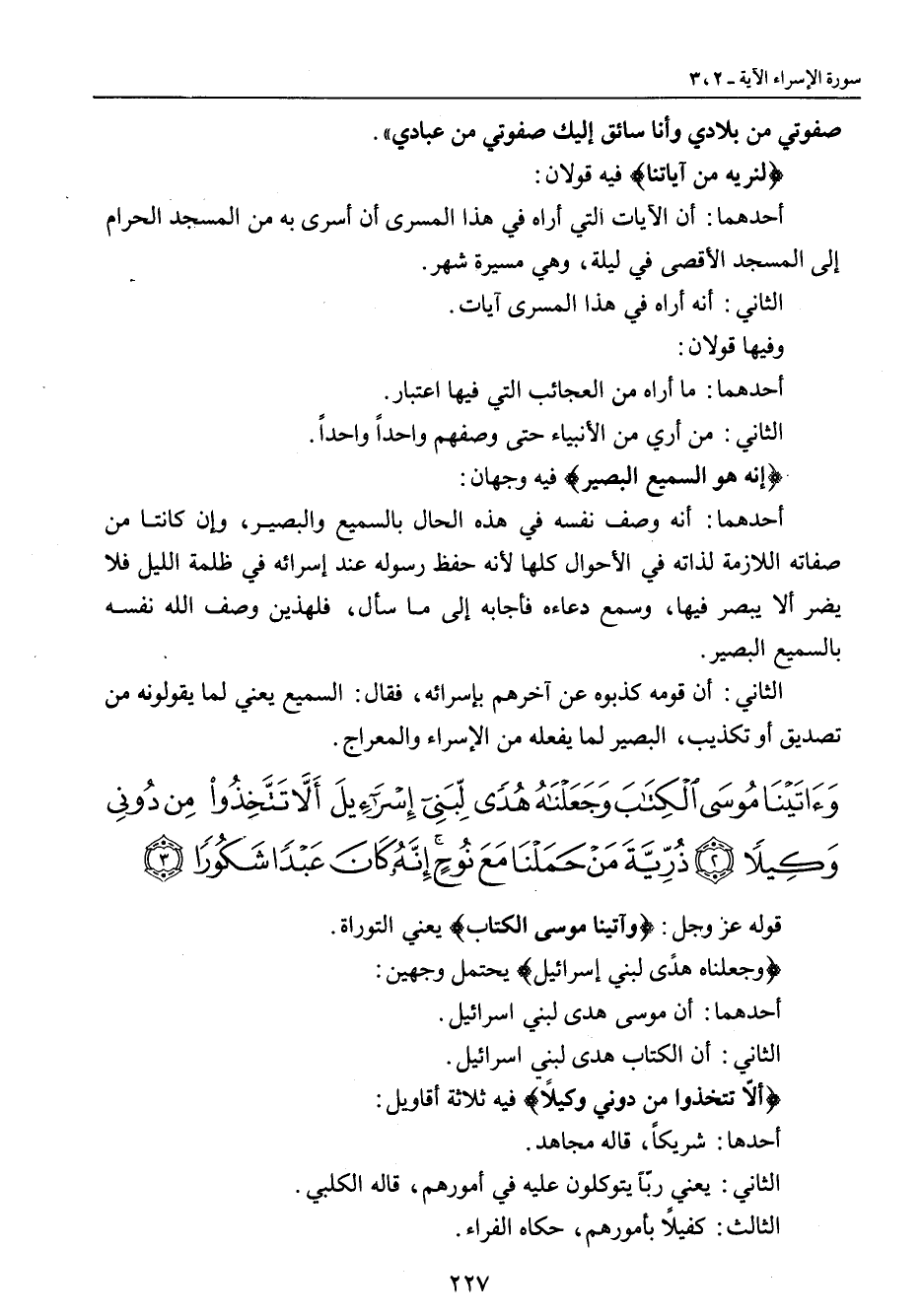أنت صفوتي من بلادي وأنا سائق إليك صفوتي من عبادي). {لنريه من آياتنا} فيه قولان: أحدهما: أن الآيات التي أراه في هذا المسرى أن أسرى به من المسجد الحرام إلى المسجد الأقصى في ليلة , وهي مسيرة شهر. الثاني: أنه أراه في هذا المسرى آيات. وفيها قولان: أحدهما: ما أراه من العجائب التي فيها اعتبار. الثاني: من أري من الأنبياء حتى وصفهم واحداً واحداً. {إنه هو السميع البصير} فيه وجهان: أحدهما: أنه وصف نفسه في هذه الحال بالسميع والبصير , وإن كانتا من صفاته اللازمة لذاته في الأحوال كلها لأنه حفظ رسوله عند إسرائه في ظلمة الليل فلا يضر ألا يبصر فيها , وسمع دعاءه فأجابه إلى ما سأل , فلهذين وصف الله نفسه بالسميع البصير. الثاني: أن قومه كذبوه عن آخرهم بإسرائه , فقال: السميع يعني لما يقولونه من تصديق أو تكذيب , البصير لما يفعله من الإسراء والمعراج.