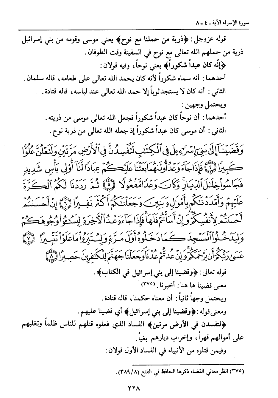 {وقضينا إلى بني إسرائيل في الكتاب لتفسدن في الأرض مرتين ولتعلن علوا كبيرا فإذا جاء وعد أولاهما بعثنا عليكم عبادا لنا أولي بأس شديد فجاسوا خلال الديار وكان وعدا مفعولا ثم رددنا لكم الكرة عليهم وأمددناكم بأموال وبنين وجعلناكم أكثر نفيرا إن أحسنتم أحسنتم لأنفسكم وإن أسأتم فلها فإذا جاء وعد الآخرة ليسوؤوا وجوهكم وليدخلوا المسجد كما دخلوه أول مرة وليتبروا ما علوا تتبيرا عسى ربكم أن يرحمكم وإن عدتم عدنا وجعلنا جهنم للكافرين حصيرا} قوله تعالى: {وقضينا إلى بني إسرائيل في الكتاب}. معنى قضينا ها هنا: أخبرنا. ويحتمل وجهاً ثانياً: أن معناه حكمنا , قاله قتادة. ومعنى قوله: {وقضينا إلى بني إسرائيل} أي قضينا عليهم. {لتفسدن في الأرض مرتين} الفاسد الذي فعلوه قتلهم للناس ظلماً وتغلبهم على أموالهم قهراً , وإخراب ديارهم بغياً. وفيمن قتلوه من الأنبياء في الفساد الأول قولان: