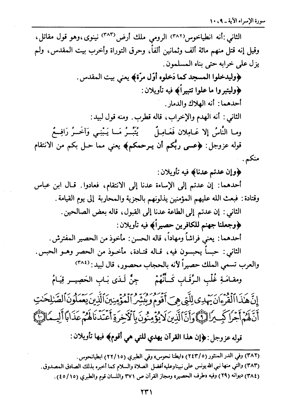 قوله عز وجل: {عسى ربُّكم أن يرحمكم} يعني مما حل بكم من الانتقام منكم. {وإن عدتم عدنا} فيه تأويلان: أحدهما: إن عدتم إلى الإساءة عدنا إلى الانتقام , فعادوا. قال ابن عباس وقتادة: فبعث الله عليهم المؤمنين يذلونهم بالجزية والمحاربة إلى يوم القيامة. الثاني: إن عدتم إلى الطاعة عدنا إلى القبول , قاله بعض الصالحين. {وجعلنا جهنم للكافرين حصيراً} فيه تأويلان: أحدهما: يعني فراشاً ومهاداً , قاله الحسن: مأخوذ من الحصير المفترش. الثاني: حبساً يحبسون فيه , قاله قتادة , مأخوذ من الحصر وهو الحبس. والعرب تسمي الملك حصيراً لأنه بالحجاب محصور , قال لبيد: