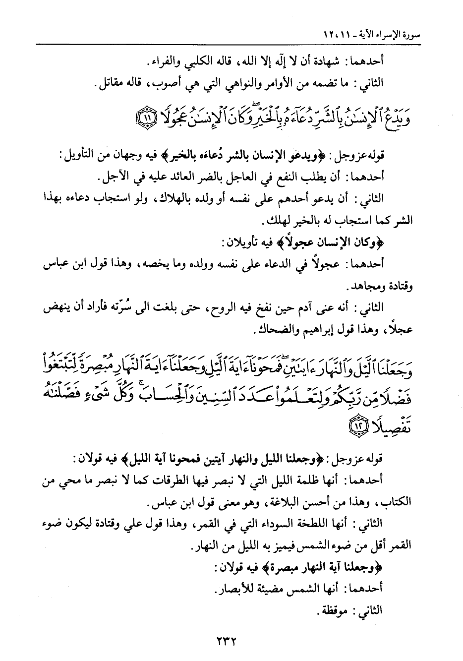 {ويدع الإنسان بالشر دعاءه بالخير وكان الإنسان عجولا} قوله عز وجل: {ويدعو الإنسان بالشر دُعاءَه بالخير} فيه وجهان من التأويل: أحدها: أن يطلب النفع في العاجل بالضر العائد عليه في الآجل. الثاني: أن يدعوا أحدهم على نفسه أو ولده بالهلاك , ولو استجاب دعاءه بهذا الشر كما استجاب له بالخير لهلك. {وكان الإنسان عجولاً} فيه تأويلان: أحدهما: عجولاً في الدعاء على نفسه وولده وما يخصه , وهذا قول ابن عباس وقتادة ومجاهد. الثاني: أنه عنى آدم حين نفخ فيه الروح , حتى بلغت إلى سُرّته فأراد أن ينهض عجلاً , وهذا قول إبراهيم والضحاك.