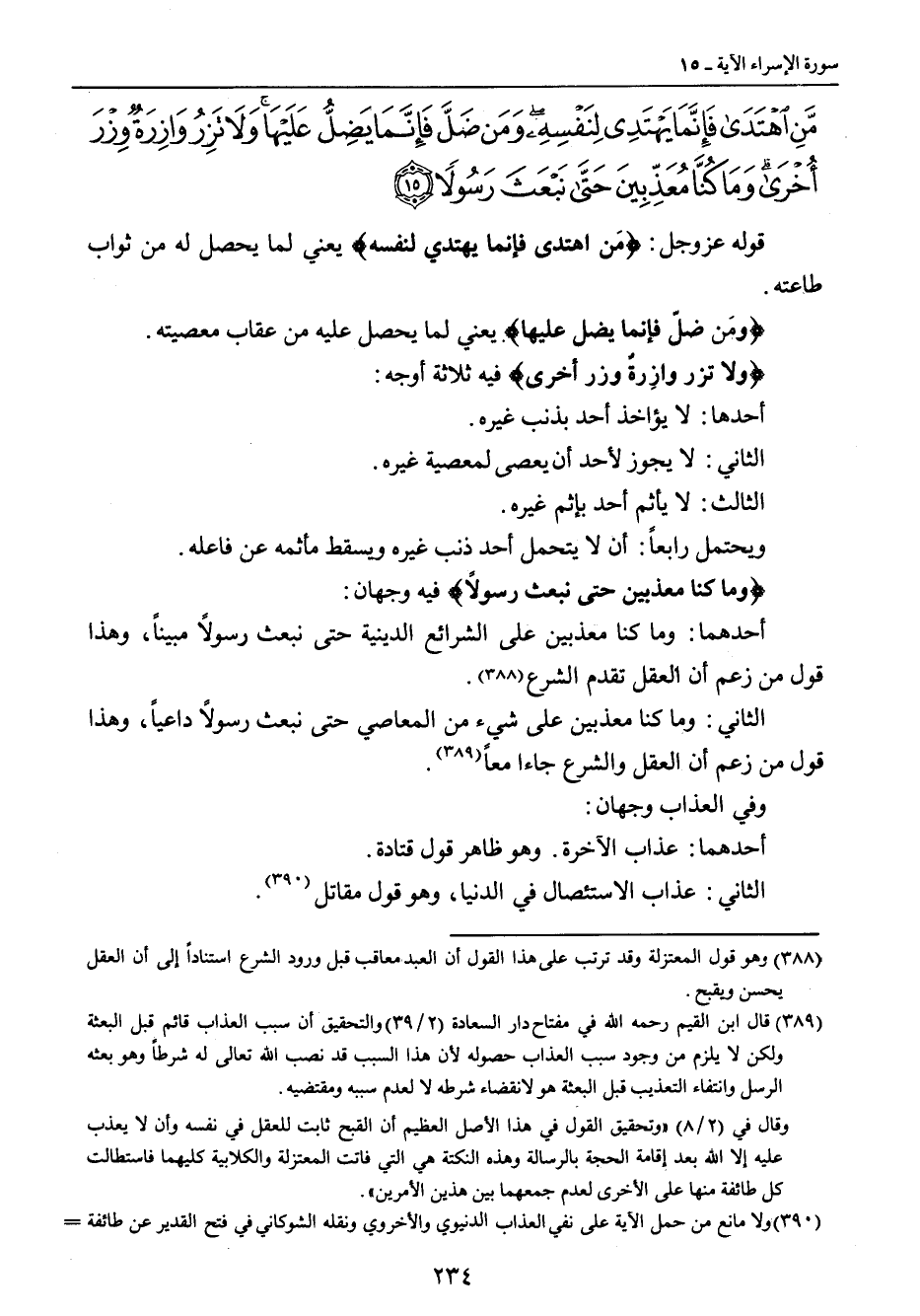 {من اهتدى فإنما يهتدي لنفسه ومن ضل فإنما يضل عليها ولا تزر وازرة وزر أخرى وما كنا معذبين حتى نبعث رسولا} قوله عز وجل: {مَن اهتدى فإنما يهتدي لنفسه} يعني لما يحصل له من ثواب طاعته. {ومَن ضلّ فإنما يضل عليها} يعني لما يحصل عليه من عقاب معصيته. {ولا تزر وازِرةٌ وزر أخرى} فيه ثلاثة أوجه: أحدها: لا يؤاخذ أحد بذنب غيره. الثاني: لا يجوز لأحد أن يعصى لمعصية غيره. الثالث: لا يأثم أحد بإثم غيره. ويحتمل رابعاً: أن لا يتحمل أحد ذنب غيره ويسقط مأثمه عن فاعله. {وما كنا معذبين حتى نبعث رسولاً} فيه وجهان: أحدهما: وما كنا معذبين على الشرائع الدينية حتى نبعث رسولاً مبيناً , وهذا قول من زعم أن العقل تقدم الشرع. الثاني: وما كنا معذبين على شيء من المعاصي حتى نبعث رسولاً داعياً , وهذا قول من زعم أن العقل والشرع جاءا معاً. وفي العذاب وجهان: أحدهما: عذاب الآخرة. وهو ظاهر قول قتادة. الثاني: عذاب بالاستئصال في الدنيا، وهو قول مقاتل.