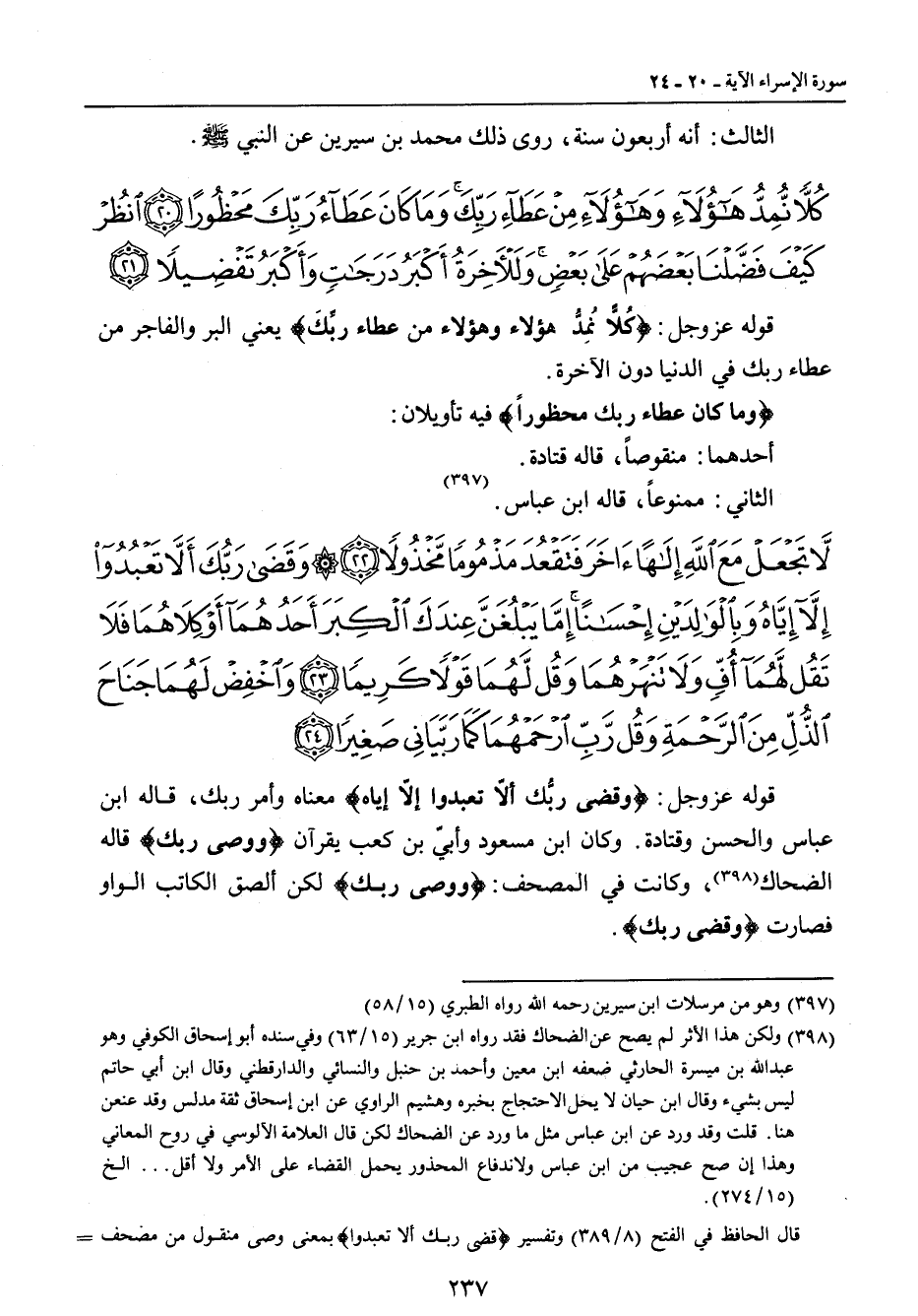 {لا تجعل مع الله إلها آخر فتقعد مذموما مخذولا وقضى ربك ألا تعبدوا إلا إياه وبالوالدين إحسانا إما يبلغن عندك الكبر أحدهما أو كلاهما فلا تقل لهما أف ولا تنهرهما وقل لهما قولا كريما واخفض لهما جناح الذل من الرحمة وقل رب ارحمهما كما ربياني صغيرا} قوله عز وجل: {وقضى ربُّك ألاّ تبعدوا إلاّ إياه} معناه وأمر ربك , قاله ابن عباس والحسن وقتادة. وكان ابن مسعود وأبيّ بن كعب يقرآن {ووصى ربك} قاله الضحاك , وكانت في المصحف: {ووصى ربك} لكن ألصق الكاتب الواو فصارت {وقضى ربك}.