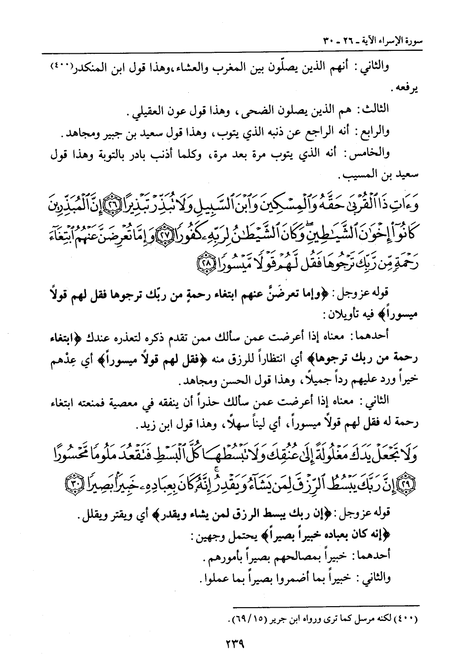{وآت ذا القربى حقه والمسكين وابن السبيل ولا تبذر تبذيرا إن المبذرين كانوا إخوان الشياطين وكان الشيطان لربه كفورا وإما تعرضن عنهم ابتغاء رحمة من ربك ترجوها فقل لهم قولا ميسورا} قوله عز وجل: {وإما تعرضَنَّ عنهم ابتغاء رحمةٍ من ربّك ترجوها فقل لهم قولاً ميسوراً} فيه تأويلان: أحدهما: معناه إذا أعرضت عمن سألك ممن تقدم ذكره لتعذره عندك {ابتغاء رحمة من ربك ترجوها} أي انتظاراً للزرق منه {فقل لهم قولاً ميسوراً} أي عِدْهم خيراً ورد عليهم رداً جميلاً , وهذا قول الحسن ومجاهد. الثاني: معناه إذا أعرضت عمن سألك حذراً أن ينفقه في معصية فمنعته ابتغاء رحمة له فقل لهم قولاً ميسوراً , أي ليناً سهلاً , وهذا قول ابن زيد.