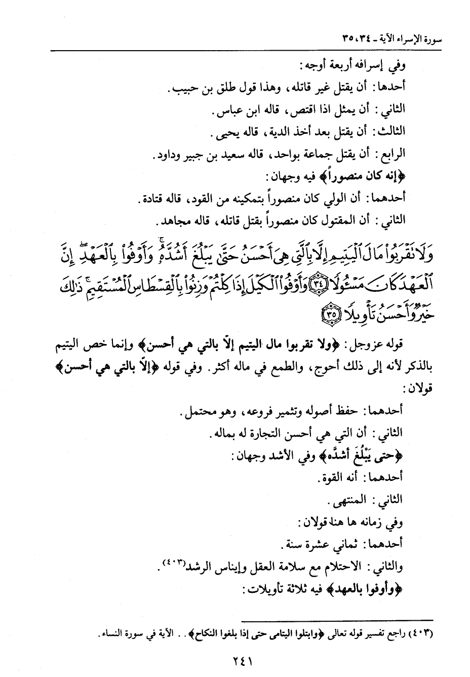 {ولا تقربوا مال اليتيم إلا بالتي هي أحسن حتى يبلغ أشده وأوفوا بالعهد إن العهد كان مسؤولا وأوفوا الكيل إذا كلتم وزنوا بالقسطاس المستقيم ذلك خير وأحسن تأويلا} قوله عز وجل: {ولا تقربوا مال اليتيم إلاّ بالتي هي أحسن} وإنما خص اليتيم بالذكر لأنه إلى ذلك أحوج , والطمع في ماله أكثر. وفي قوله {إلاّ بالتي هي أحسن} قولان: أحدهما: حفظ أصوله وتثمير فروعه , وهو محتمل. الثاني: أن التي هي أحسن التجارة له بماله. {حتى يَبْلُغَ أَشدَّه} وفي الأشد وجهان: أحدهما: أنه القوة. الثاني: المنتهى. وفي زمانه ها هنا قولان: أحدهما: ثماني عشرة سنة. والثاني: الاحتلام مع سلامة العقل وإيناس الرشد. {وأوفوا بالعهد} فيه ثلاثة تأويلات: