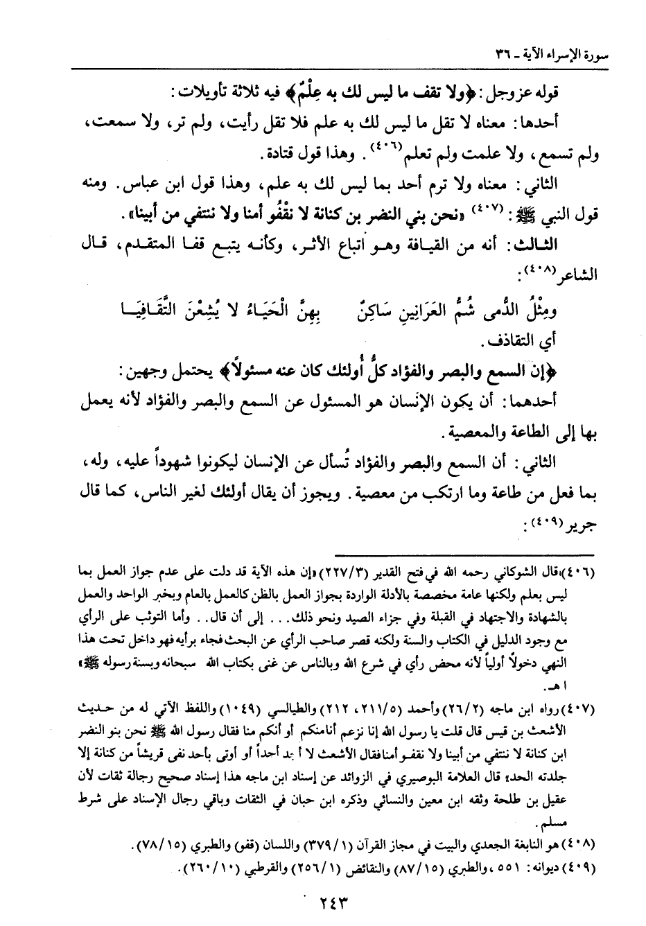 أي التقاذف. {إن السمع والبصر والفؤاد كلُّ أُولئك كان عنه مسئولاً} يحتمل وجهين: أحدهما: أن يكون الإنسان هو المسئول عن السمع والبصر والفؤاد لأنه يعمل بها إلى الطاعة والمعصية. الثاني: أن السمع والبصر والفؤاد تُسأل عن الإنسان ليكونوا شهوداً عليه، وله، بما فعل من طاعة وما ارتكب من معصية , ويجوز أن يقال أولئك لغير الناس، كما قال جرير: