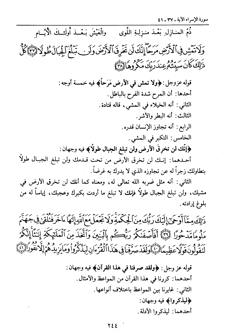 {ولا تمش في الأرض مرحا إنك لن تخرق الأرض ولن تبلغ الجبال طولا كل ذلك كان سيئه عند ربك مكروها} قوله عز وجل: {ولا تمش في الأرض مَرَحاً} فيه خمسة أوجه: أحدها: أن المرح شدة الفرح بالباطل. الثاني: أنه الخيلاء في المشي , قاله قتادة. الثالث: أنه البطر والأشر. الرابع: أنه تجاوز الإنسان قدره. الخامس: التكبر في المشي. {إنّك لن تخرِقَ الأرض ولن تبلغ الجبال طولاً} فيه وجهان: أحدهما: إنك لن تخرق الأرض من تحت قدمك ولن تبلغ الجبال طولاً بتطاولك زجراً له عن تجاوزه الذي لا يدرك به غرضاً. الثاني: أنه مثل ضربه الله تعالى له , ومعناه كما أنك لن تخرق الأرض في مشيك , ولن تبلغ الجبال طولاً فإنك لا تبلغ ما أردت بكبرك وعجبك , إياساً له من بلوغ إرادته.