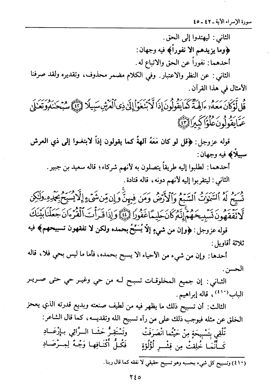 {تسبح له السماوات السبع والأرض ومن فيهن وإن من شيء إلا يسبح بحمده ولكن لا تفقهون تسبيحهم إنه كان حليما غفورا} قوله عز وجل: {وإن من شيءٍ إلاّ يُسَبِّحُ بحمده ولكن لا تفقهون تسبيحهم} فيه ثلاثة أقاويل: أحدها: وإن من شيء من الأحياء الا يسبح بحمده , فأما ما ليس بحي فلا , قاله الحسن. الثاني: إن جميع المخلوقات تسبح له من حي وغير حي حتى صرير الباب , قاله إبراهيم. الثالث: أن تسبيح ذلك ما يظهر فيه من لطيف صنعته وبديع قدرته الذي يعجز الخلق عن مثله فيوجب ذلك على من رآه تسبيح الله وتقديسه , كما قال الشاعر: