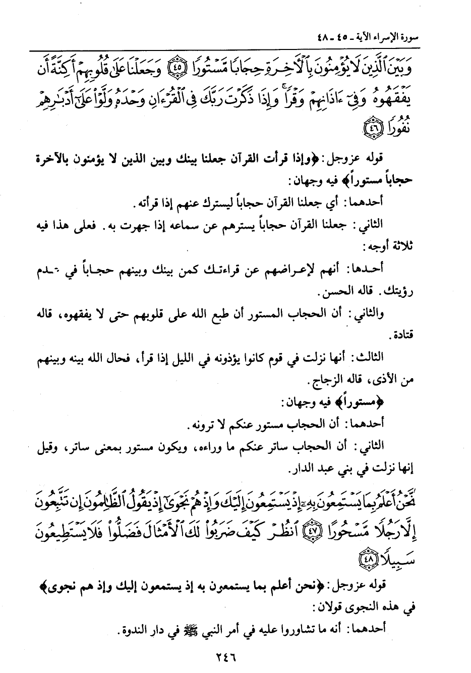 {وإذا قرأت القرآن جعلنا بينك وبين الذين لا يؤمنون بالآخرة حجابا مستورا وجعلنا على قلوبهم أكنة أن يفقهوه وفي آذانهم وقرا وإذا ذكرت ربك في القرآن وحده ولوا على أدبارهم نفورا} قوله عز وجل: {وإذا قرأت القرآن جلعنا بينك وبين الذين لا يؤمنون بالآخرة حجاباً مستوراً} فيه وجهان: أحدهما: أي جعلنا القرآن حجاباً ليسترك عنهم إذا قرأته. الثاني: جعلنا القرآن حجاباً يسترهم عن سماعه إذا جهرت به. فعلى هذا فيه ثلاثة أوجه: أحدها: أنهم لإعراضهم عن قراءتك كمن بينك وبينهم حجاباً في عدم رؤيتك. قاله الحسن. والثاني: أن الحجاب المستور أن طبع الله على قلوبهم حتى لا يفقهوه , قاله قتادة. الثالث: أنها نزلت في قوم كانوا يؤذونه في الليل إذا قرأ , فحال الله بينه وبينهم من الأذى , قاله الزجاج. {مستوراً} فيه وجهان: أحدهما: أن الحجاب مستور عنكم لا ترونه. الثاني: أن الحجاب ساتر عنكم ما وراءه , ويكون مستور بمعنى ساتر , وقيل إنها نزلت في بني عبد الدار.