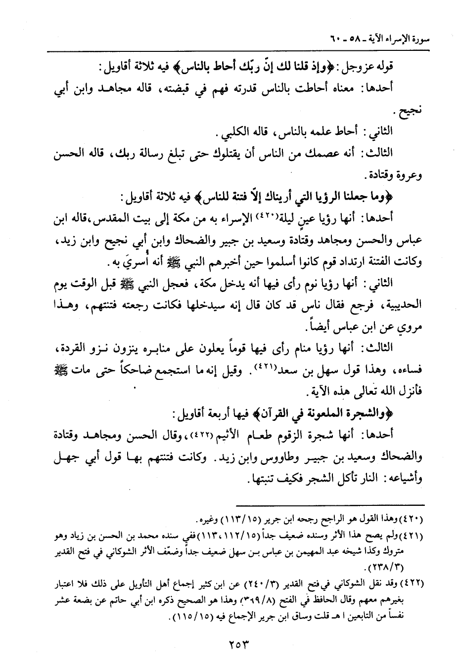 قوله عز وجل: {وإذا قلنا لك إنّ ربّك أحاط بالناس} فيه ثلاثة أقاويل: أحدها: معناه أحاطت بالناس قدرته فهم في قبضته , قاله مجاهد وابن أبي نجيح. الثاني: أحاط علمه بالناس , قاله الكلبي. الثالث: أنه عصمك من الناس أن يقتلوك حتى تبلغ رسالة ربك , قاله الحسن وعروة وقتادة. {وما جعلنا الرؤيا التي أريناك إلاّ فتنة للناس} فيه ثلاثة أقاويل: أحدها: أنها رؤيا عين ليلة الإسراء به من مكة إلى بيت المقدس , قاله ابن عباس والحسن ومجاهد وقتادة وسعيد بن جبير والضحاك وابن أبي نجيح وابن زيد , وكانت الفتنة ارتداد قوم كانوا أسلموا حين أخبرهم النبي صلى الله عليه وسلم أنه أُسريَ به. الثاني: أنها رؤيا نوم رأى فيها أنه يدخل مكة , فعجل النبي صلى الله عليه وسلم قبل الوقت يوم الحيبية , فرجع فقال ناس قد كان قال إنه سيدخلها فكانت رجعته فتنتهم , وهذا مروي عن ابن عباس أيضاً. الثالث: أنها رؤيا منام رأى فيها قوماً يعلون على منابره ينزون نزو القردة. فساءه , وهذا قول سهل بن سعد. وقيل إنه ما استجمع ضاحكاً حتى مات صلى الله عليه وسلم فأنزل الله تعالى هذه الآية. {والشجرة الملعونة في القرآن} فيها أربعة أقاويل: أحدها: أنها شجرة الزقوم طعام الأثيم , وقال الحسن ومجاهد وقتادة والضحاك وسعيد بن جبير وطاووس وابن زيد. وكانت فتنتهم بها قول أبي جهل وأشياعه: النار تأكل الشجر فكيف تنبتها.