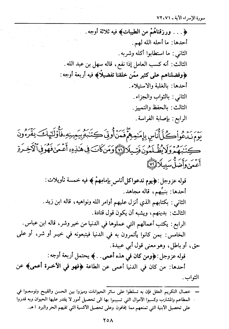 { ... ورزقناهُمْ من الطيبات} فيه ثلاثة أوجه: أحدها: ما أحله الله لهم. الثاني: ما استطابوا أكله وشربه. الثالث: أنه كسب العامل إذا نفع , قاله سهل بن عبد الله. {وفضلناهم على كثير ممّن خلقنا تفضيلاً} فيه أربعة أوجه: أحدها: بالغلبة والاستيلاء. الثاني: بالثواب والجزاء. الثالث: بالحفظ والتمييز. الرابع: بإصابة الفراسة.