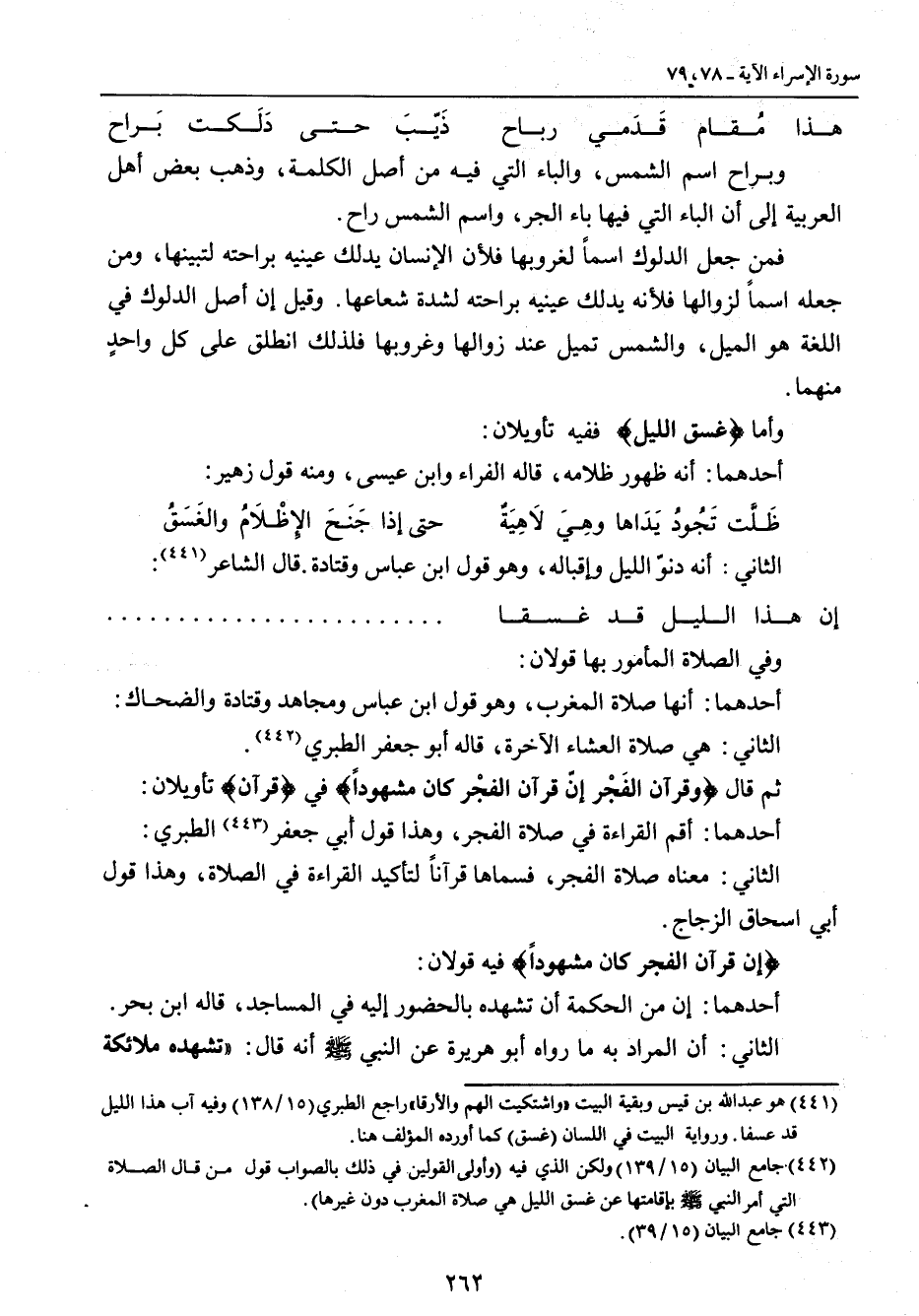 وفي الصلاة المأمور بها قولان: أحدهما: أنها صلاة المغرب , وهو قول ابن عباس ومجاهد وقتادة والضحاك الثاني: هي صلاة العشاء الآخرة , قاله أبو جعفر الطبري. ثم قال {وقرآن الفَجْر إنّ قرآن الفجْر كان مشهوداً} في {قرآن} تأويلان: أحدهما: أقم القراءة في صلاة الفجر , وهذا قول أبي جعفر الطبري. الثاني: معناه صلاة الفجر , فسماها قرآناً لتأكيد القراءة في الصلاة , وهذا قول أبي اسحاق الزجاج. {إن قرآن الفجر كان مشهوداً} فيه قولان: أحدهما: إن من الحكمة أن تشهده بالحضور إليه في المساجد , قاله ابن بحر. الثاني: ان المراد به ما رواه أبو هريرة عن النبي صلى الله عليه وسلم أنه قال: (تشهده ملائكة