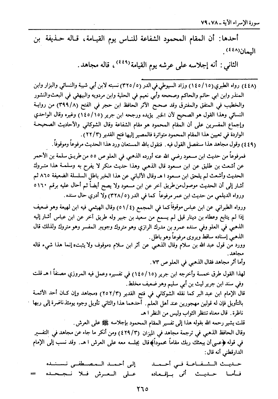 أحدها: أن المقام المحمود الشفاعة للناس يوم القيامة، قاله حذيفة بن اليمان. الثاني: أنه إجلاسه على عرشه يوم القيامة، قاله مجاهد.