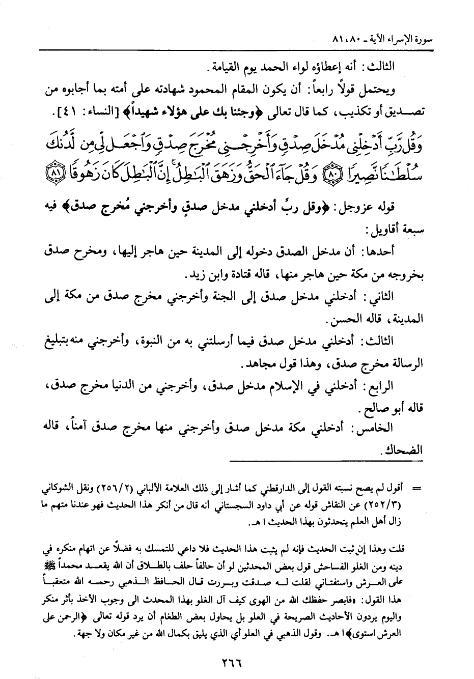 {وقل رب أدخلني مدخل صدق وأخرجني مخرج صدق واجعل لي من لدنك سلطانا نصيرا وقل جاء الحق وزهق الباطل إن الباطل كان زهوقا} قوله عز وجل: {وقل ربِّ أدخلني مدخل صدقٍ وأخرجني مُخرج صدق} فيه سبعة أقاويل: أحدها: أن مدخل الصدق دخوله إلى المدينة حين هاجر إليها , ومخرج صدق بخروجه من مكة حين هاجر منها , قاله قتادة وابن زيد. الثاني: أدخلني مدخل صدق إلى الجنة وأخرجني مخرج صدق من مكة إلى المدينة , قاله الحسن. الثالث: أدخلني مدخل صدق فيما أرسلتني به من النبوة , وأخرجني منه بتبليغ الرسالة مخرج صدق , وهذا قول مجاهد. الرابع: أدخلني في الإسلام مدخل صدق , وأخرجني من الدنيا مخرج صدق , قاله أبو صالح. الخامس: أدخلني مكة مدخل صدق وأخرجني منها مخرج صدق آمناً، قاله الضحاك.