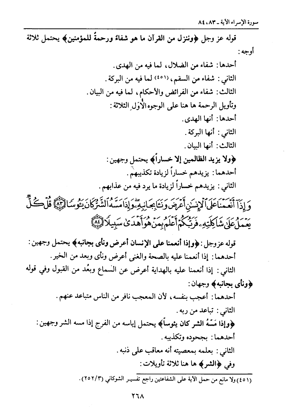 قوله عز وجل: {وننزل من القرآن ما هو شفاءٌ ورحمةٌ للمؤمنين} يحتمل ثلاثة أوجه: أحدها: شفاء من الضلال , لما فيه من الهدى. الثاني: شفاء من السقم , لما فيه من البركة. الثالث: شفاء من الفرائض والأحكام , لما فيه من البيان. وتأويله الرحمة ها هنا على الوجوه الأُوَلِ الثلاثة: أحدها: أنها الهدى. الثاني: أنها البركة. الثالث: أنها البيان. {ولا يزيد الظالمين إلا خساراً} يحتمل وجهين: أحدهما: يزيدهم خساراً لزيادة تكذيبهم. الثاني: يزيدهم خساراً لزيادة ما يرد فيه من عذابهم.